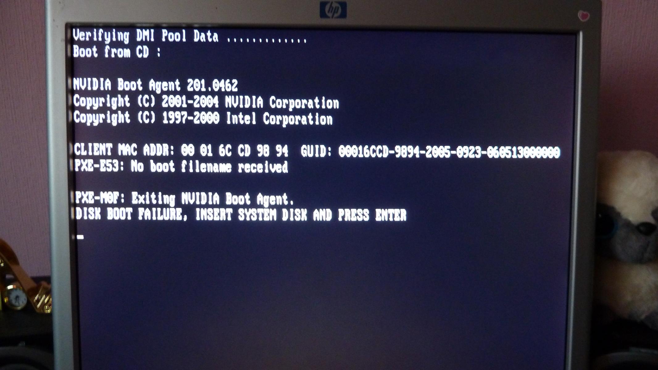 Ich glaube, der Rechner versucht vom Netzwerk zu booten. Kontrolliere mal die BIOS-Settings und stelle die Festplatte als erstes Boot-Device ein.