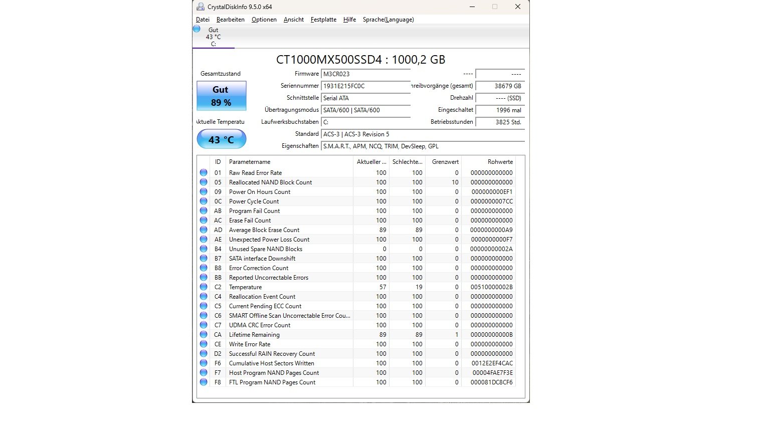 Festplatte sieht soweit erstmal gut aus ! Ist halt wie bei iPhone heutzutage m.2 SSD haben begrenzte Lebensdauer wie Akkus beim Handy & speicher deshalb auch die Anzeige mit nur 89%.