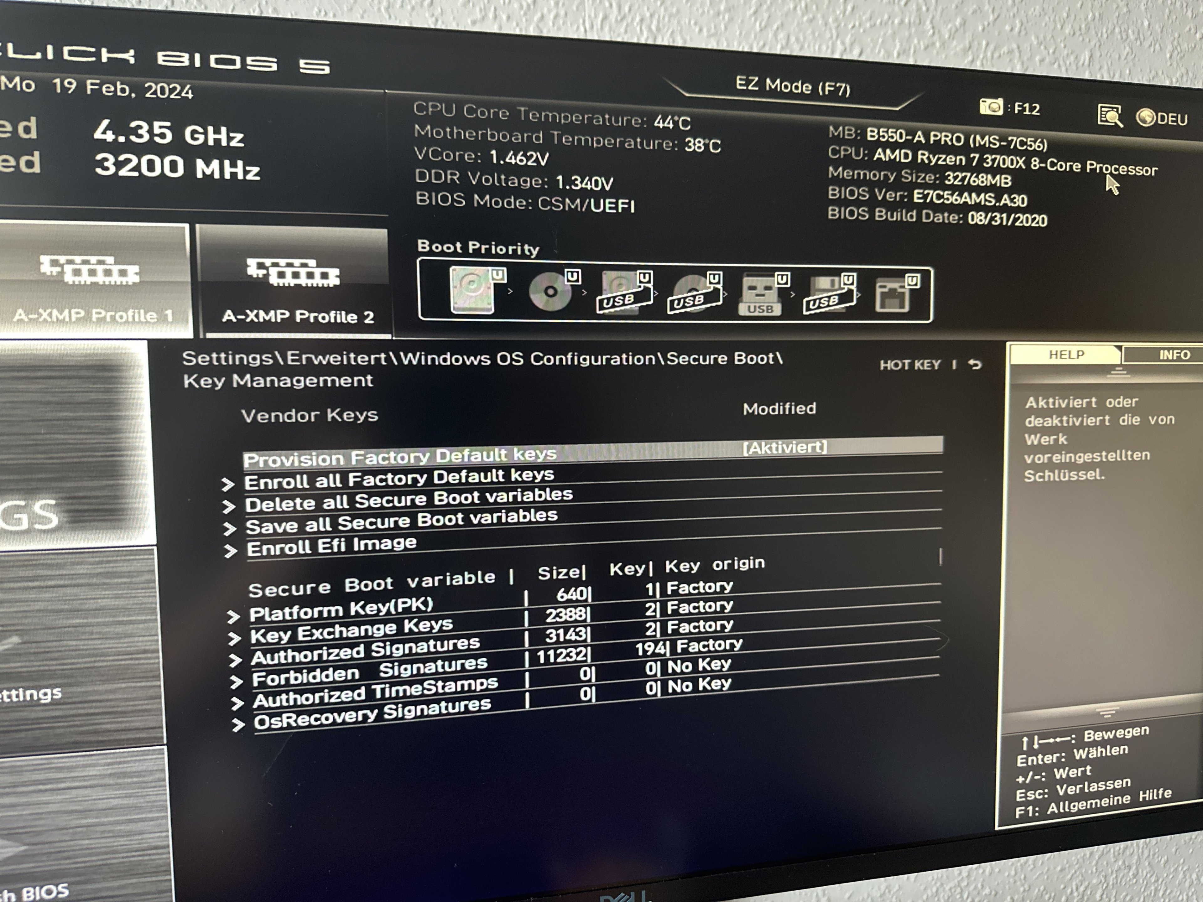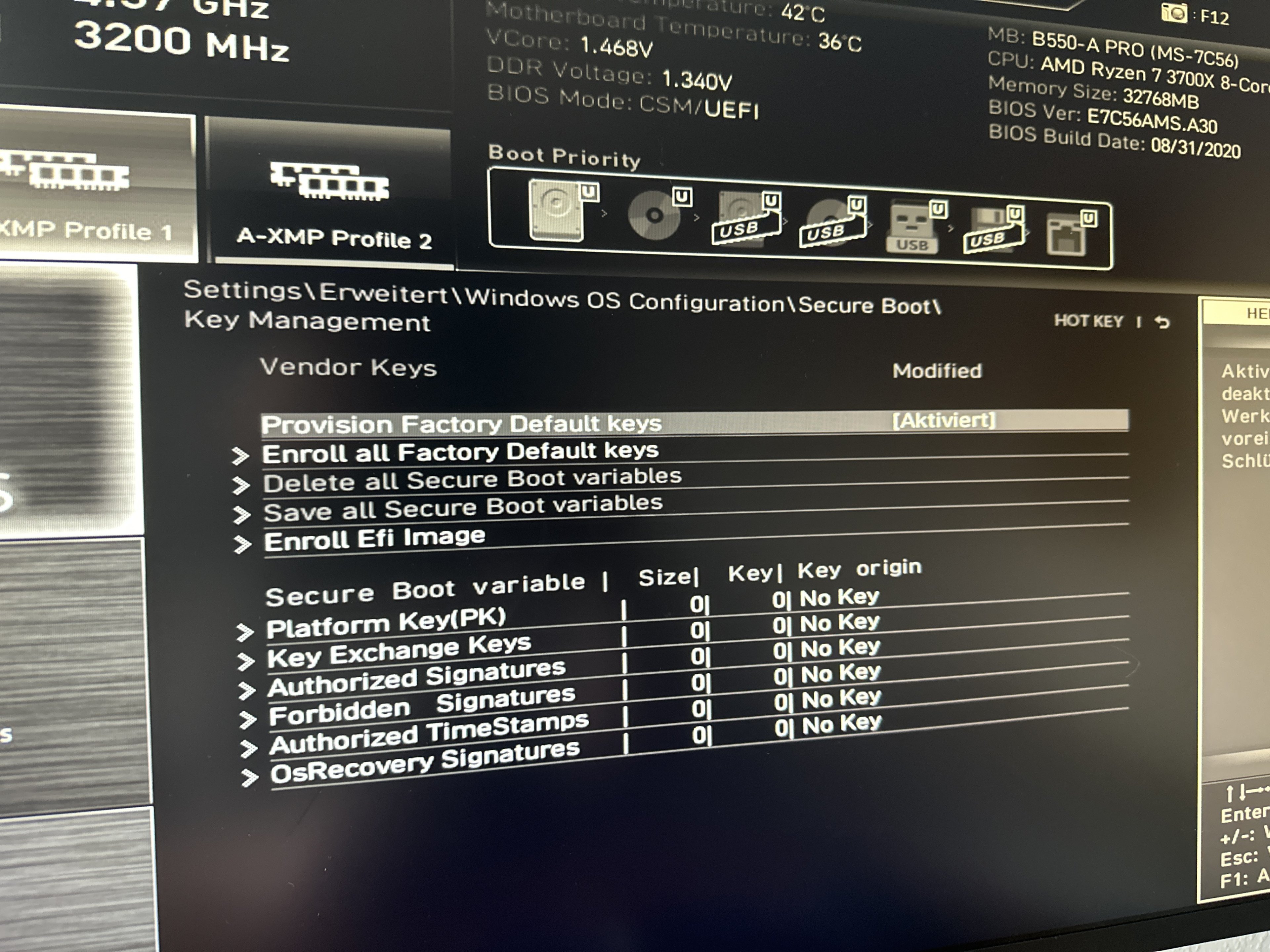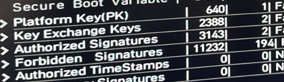 Startet leider nicht (s. Bild und Keys zusätzlich enrollt) - lasse ich es "deaktiviert"; aber auf "Custom" lädt es und startet wie gewöhnlichcvzone schrieb:Dann mal den Secure Boot Modus von "Standard" auf "User" stellen versuchen.