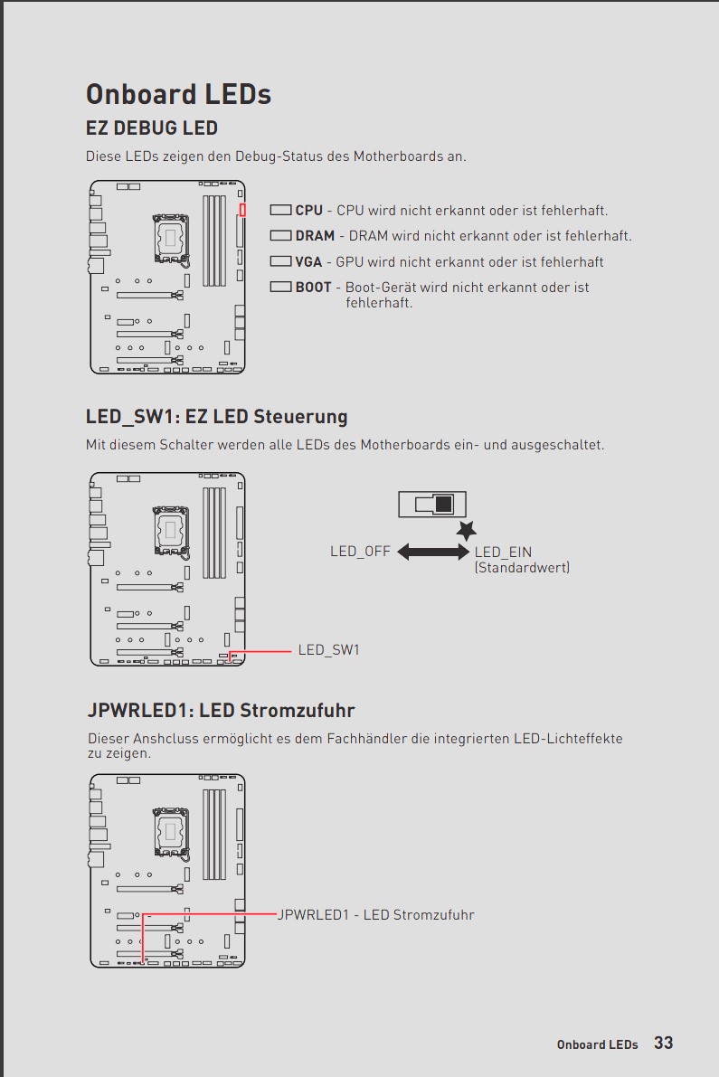 Welche genau? Das ist wahrscheinlich keine Standby-LED. Sondern eine, die einen Fehlercode ausgibt. Wäre bei deinem Board die CPU LED. Siehe Screenshot. Bitte bestätige die Position der roten LED auf Deinem Board: Stimmt sie mit der auf dem Screenshot überein?