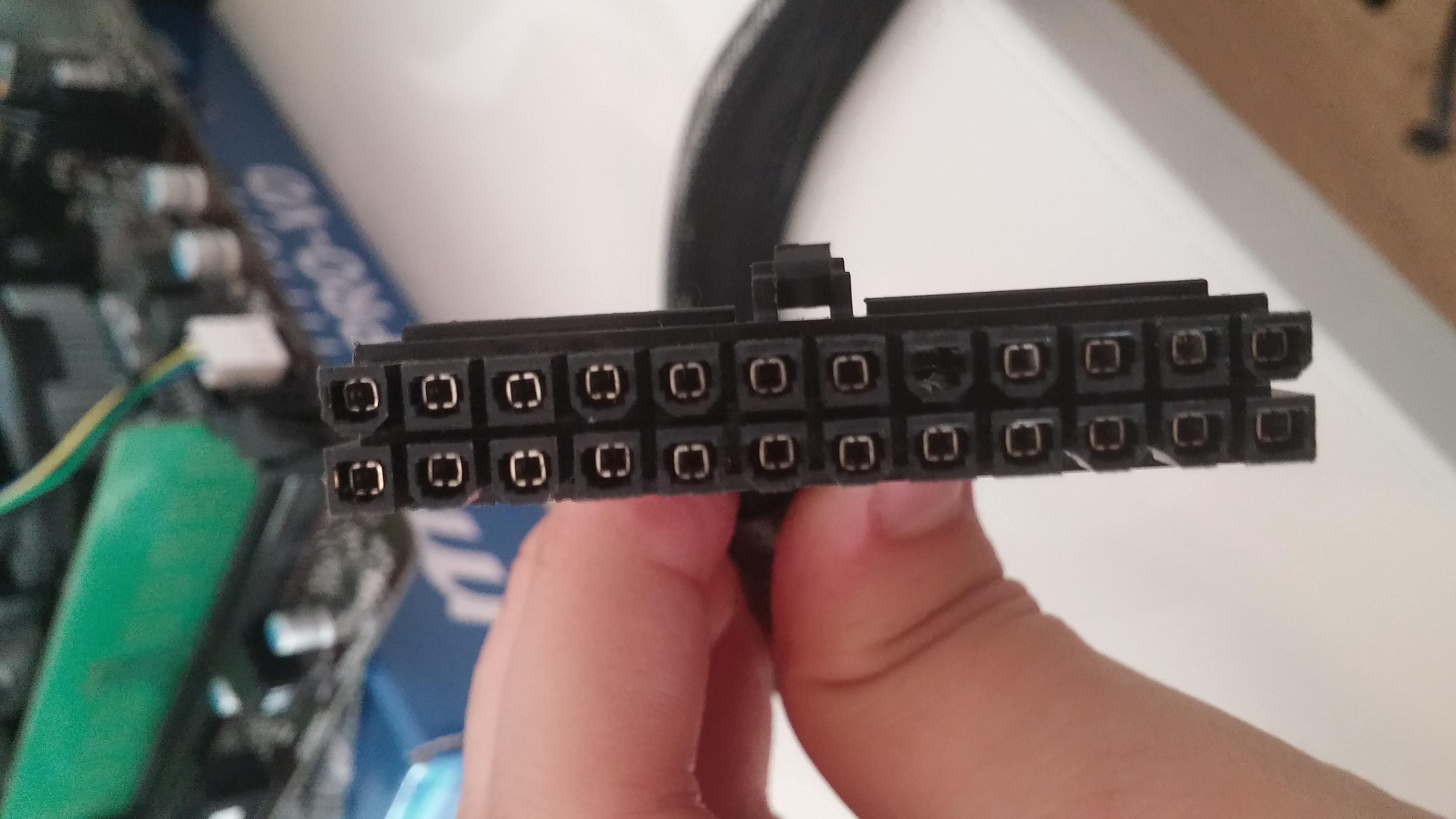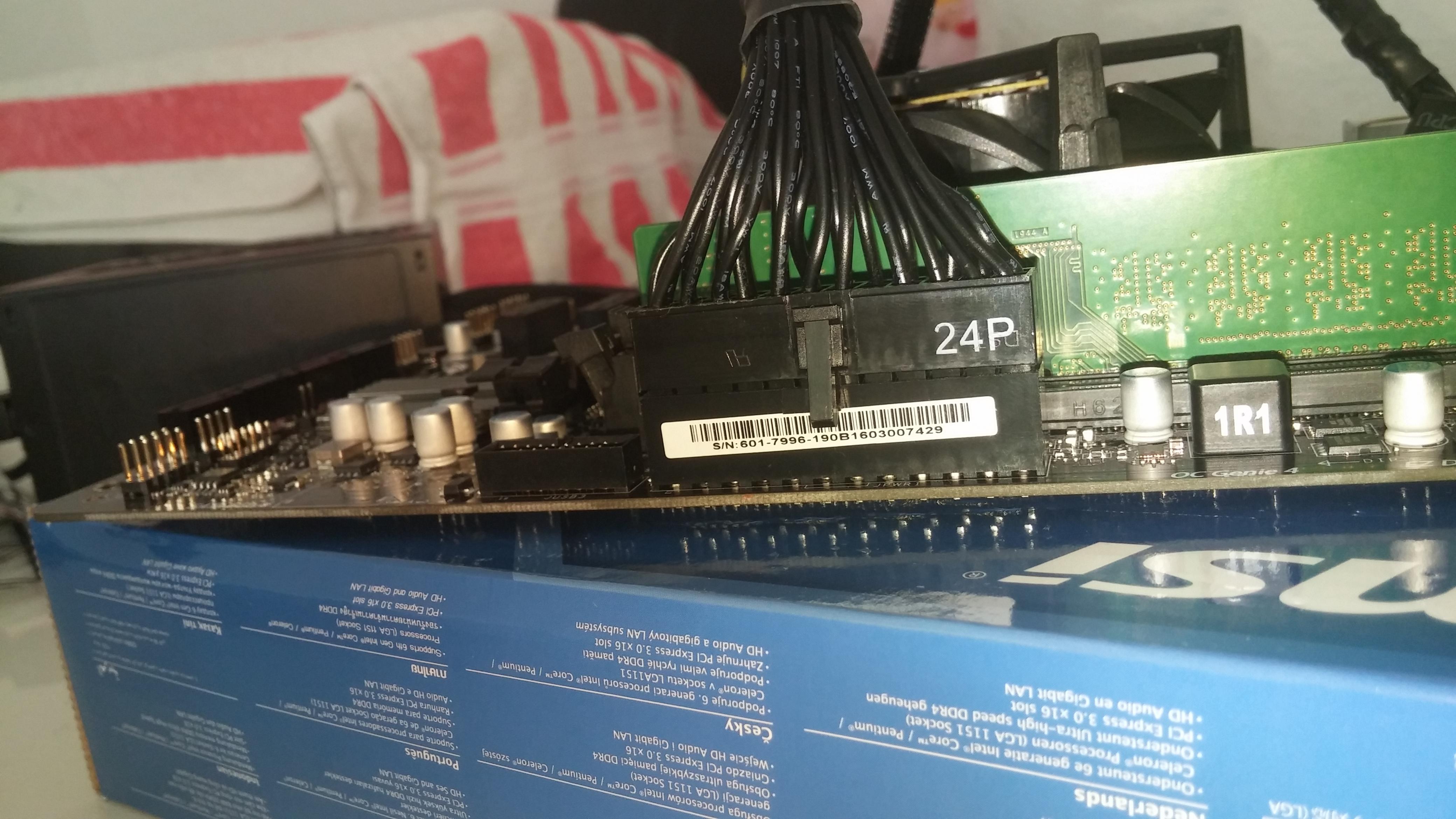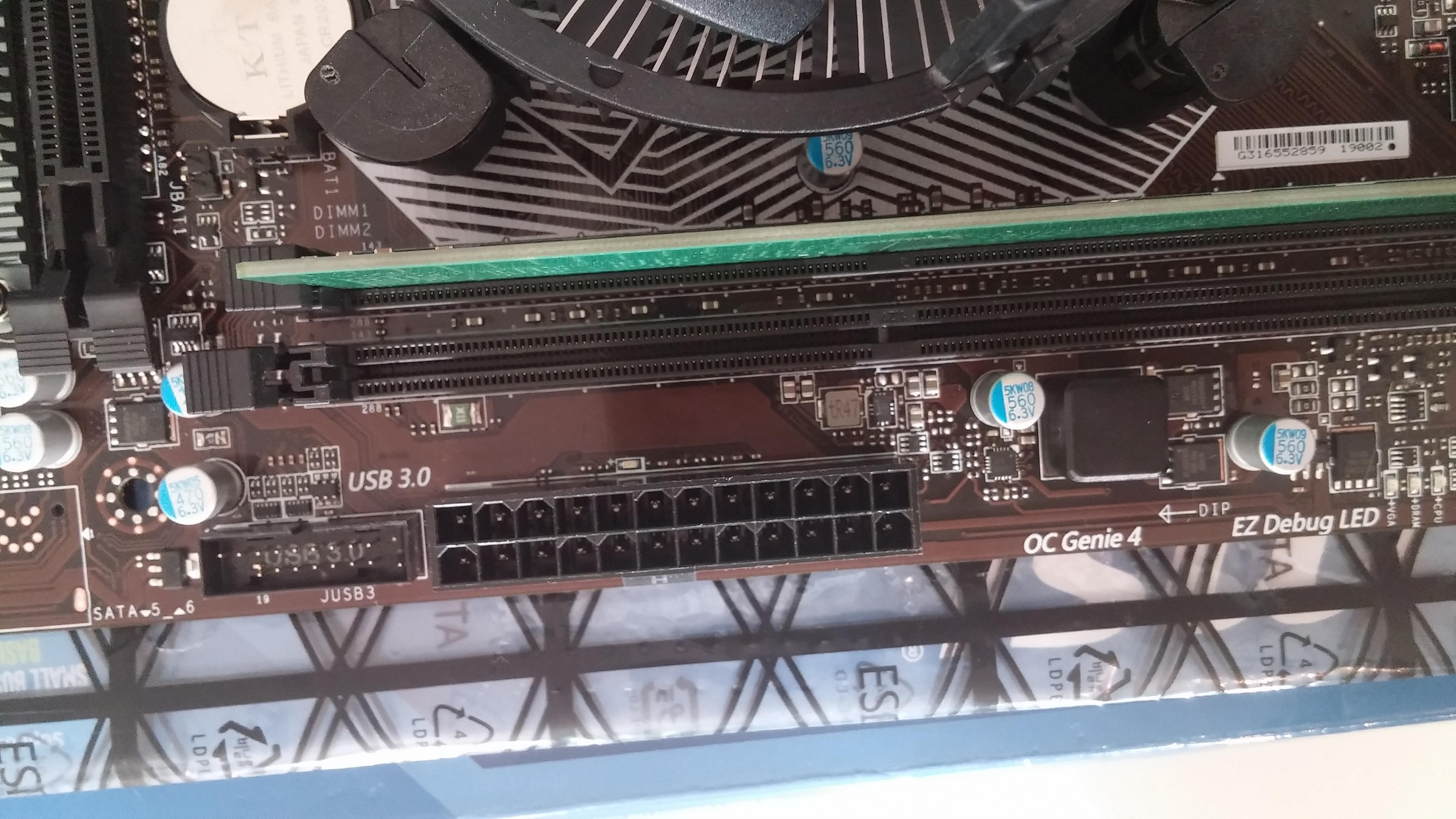 Das Interessante ist wenn ich den 24Pin Stecker nur leicht reinstecke dann fängt der Kühler an zu drehen und auch der Netzteil Lüfter dreht sich langsam und am Mainboard blinkt die EZ Debug LED CPU. Wenn ich den 24Pin ganz reinstecke hört der Lüfter an zu drehen und die LED blinkt auch nicht mehr.