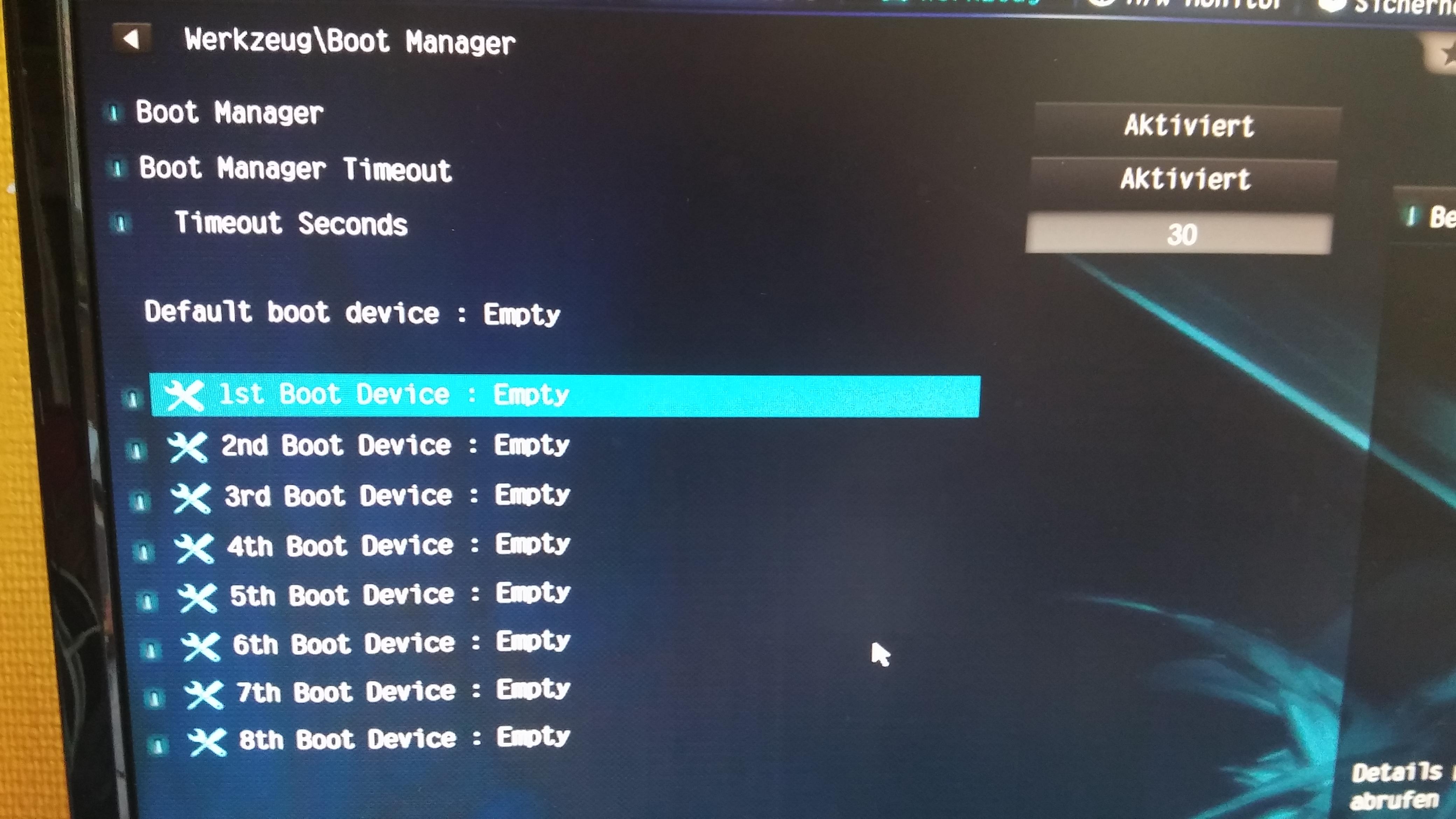 Falscher Eintrag im UEFI. Ich habe "Windows Boot Manager" als Boot Device 1 eingestellt und "Sata: SSD" als Boot Device 2
