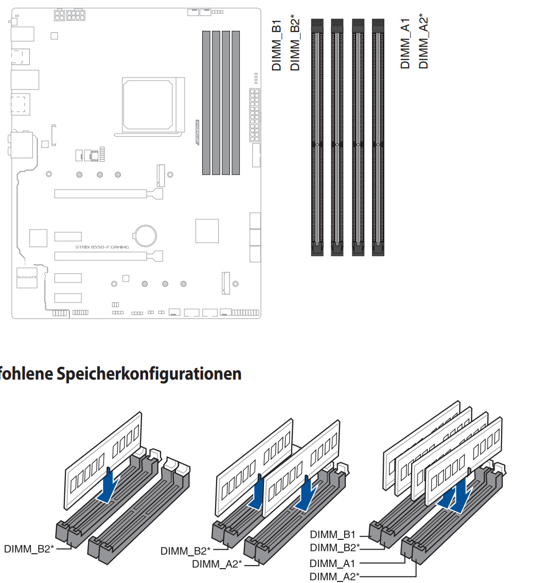 Mit einem RAM Riegel im A2 (ganz Rechts) startet der PC (empfohlen von ASUS ist allerdings der Slot B2bei Einzelbetrieb). Von jedem anderen Slot aus startet er nicht. Auch nicht, wenn ich beide Riegel in A1 oder B1 stecke. NUR von A2.