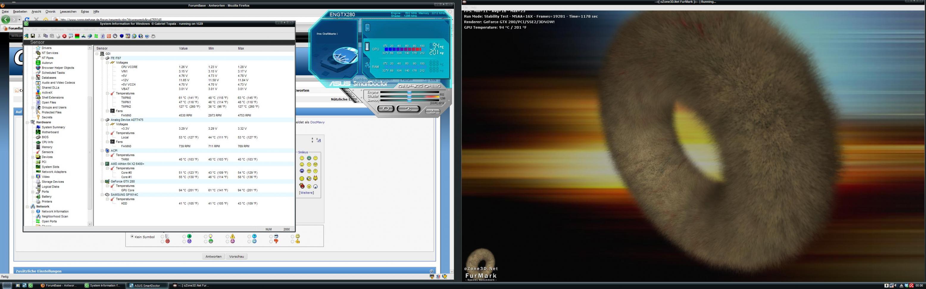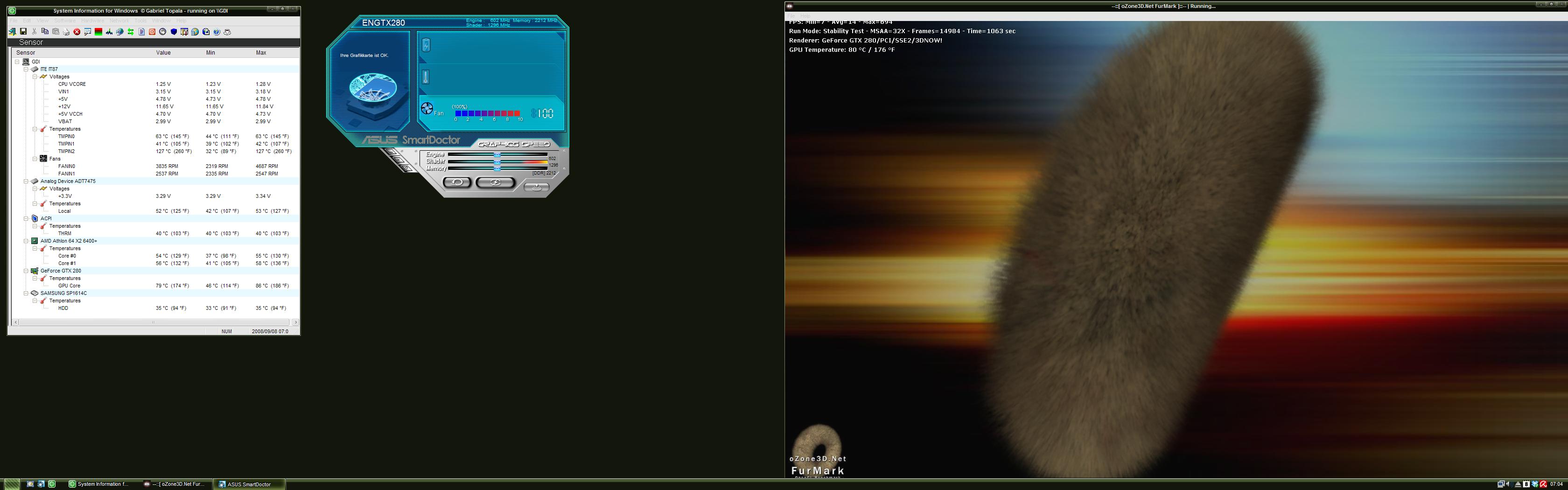 EDIT: hab eben 1063 sekundenlang mal furmark laufen lassen. auflösung 1680*1050 und 32xMSAA. die temp der grafikkarte ging nicht über 80 grad und auch der rest sollte nun in einem humanen bereicht sein. korrigiert mich, wenn ich falsch liege. auf dem bild "temp_update" hatte die grafikkarte einen spitzenwert von 86 grad, allerdings hatte ich da die lüftersteurerung anders. zum schluss ging die karte nicht über 80 grad. der lüfter der gtx280 lief immer so zwischen 75% und 100%. ich müsste jetzt mal beobachten, ob crysis und grid noch immer abstürzen. möglicheriwese hab ich das hitzeproblem jetzt im griff. und vielleicht war es nur ein hitzeproblem. hatte nämlich auch nen bluescreen und das is ja ein indiz für überhitzung. vielleicht habe ich doch glück und kann bei meinem netzteil bleiben. ich werde heute mal viel crysis und grid laufen lassen... nach dem furmark-test fiel auch die CPU-temp wieder auf 39-40 grad und hält sich. boar bei ca. 40 grad. sieht jetzt alles viel besser aus als vorher. so ein frontventilator bringts ganz schön.