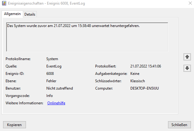Habe mal im Ereignisprotokoll versucht danach zu suchen und diese 2 hier finden können(Fotos im Anhang).