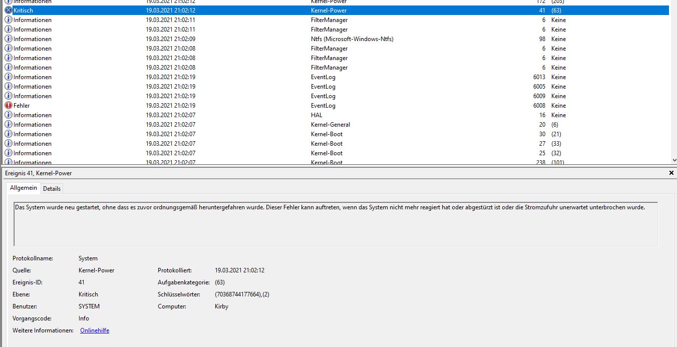 In den Windows-Protokollen unter Windows 10 kann ich leider nicht sehr viel erkennen und sagen ob dort etwas von Wichtigkeit drinsteht. Hast es vielleicht etwas mit dieser Ereignis-ID 41 auf sich? Ich habe auch nochmal ein Bild mit ran gehangen...