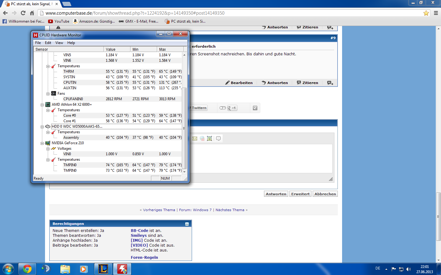Dazu sollte ich sagen, dass ich bis gestern eine 32 Bit Version von Windows XP hatte und erst gestern auf Windows 7 umgestiegen bin. Allein schon, weil ich nicht einmal meinen kompletten Arbeitsspeicher nutzen konnte. Zu heiß wird der Rechner denke ich nicht, es passiert ja manchmal schon, nachdem ich nur 5 Minuten gespielt habe. Ich hoffe, ihr könnt mir weiterhelfen, ich werde versuchen, möglichst viel auszuprobieren, damit ich das Problem beseitigen kann.