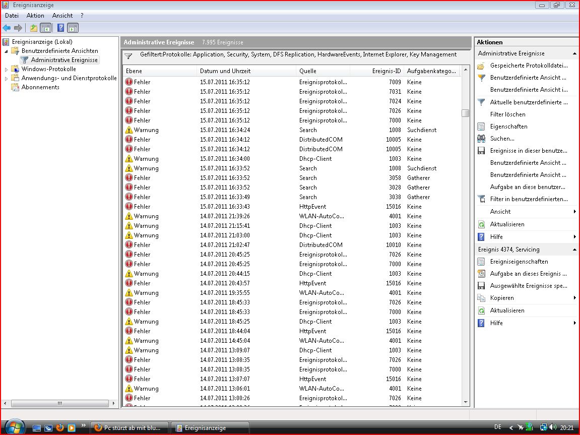 Er stürzt bei den verschiedensten Anwendungen ab, Word, Videos, Spiele aber auch ganz normal auf dem Desktop. Hab stark die Grafikkarte in verdacht(GT430), weil sie einmal garnicht im Gerätemanager angezeigt wurde. Beim nächsten hochfahren war alles wieder normal, die Graka wurde auch wieder angezeigt. Hab schon alles versucht, Systemwiederherstellung, neuster Treiber. Temps sind auch normal Idel: 30; Spiele: 45