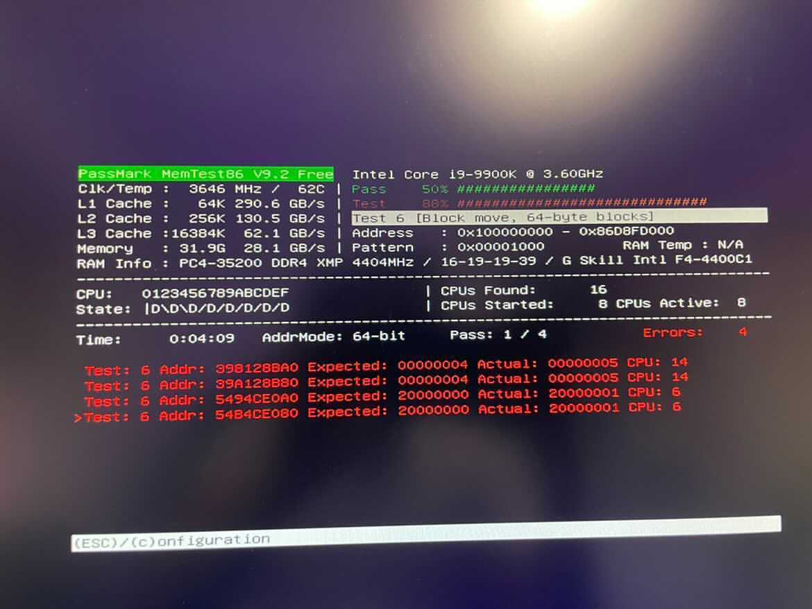 Da naheliegend war, dass entweder der RAM oder das Mainboard hinüber sind, habe ich den RAM intensiv getestet (MemTest und MemTest86). Mit XMP, ohne XMP, auf allen Stufen von 4400 bis auf 3200 runter. Einmal zeigte MemTest86 mehrere Fehler bei Test 6 an, weshalb ich noch zwei weitere Male den gleichen Test machte, allerdings beide Male ohne Fehlermeldungen. Um einen Defekt des RAMs auszuschließen, habe ich alle Riegel nochmal einzeln getestet (immer nur einer im System) und alle Tests (MemTest, MemTest86) waren unauffällig.