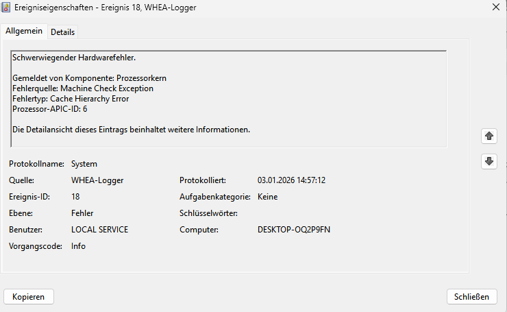 ...Seit ungefähr 3 Monaten stürzt mein PC gern mal ab,seit dem genau 4 mal,ob im Idle oder unter Last beim Gaming.Habe dementsprechend mal in die Ereignisanzeige geschaut und immer wenn es auftritt steht da nen WHEA Fehler.Desweiteren habe ich bemerkt,dass sehr oft so Frametimespikes auftreten wo auch kurz die FPS droppen und nen kurzer Ruckler dadurch entsteht.