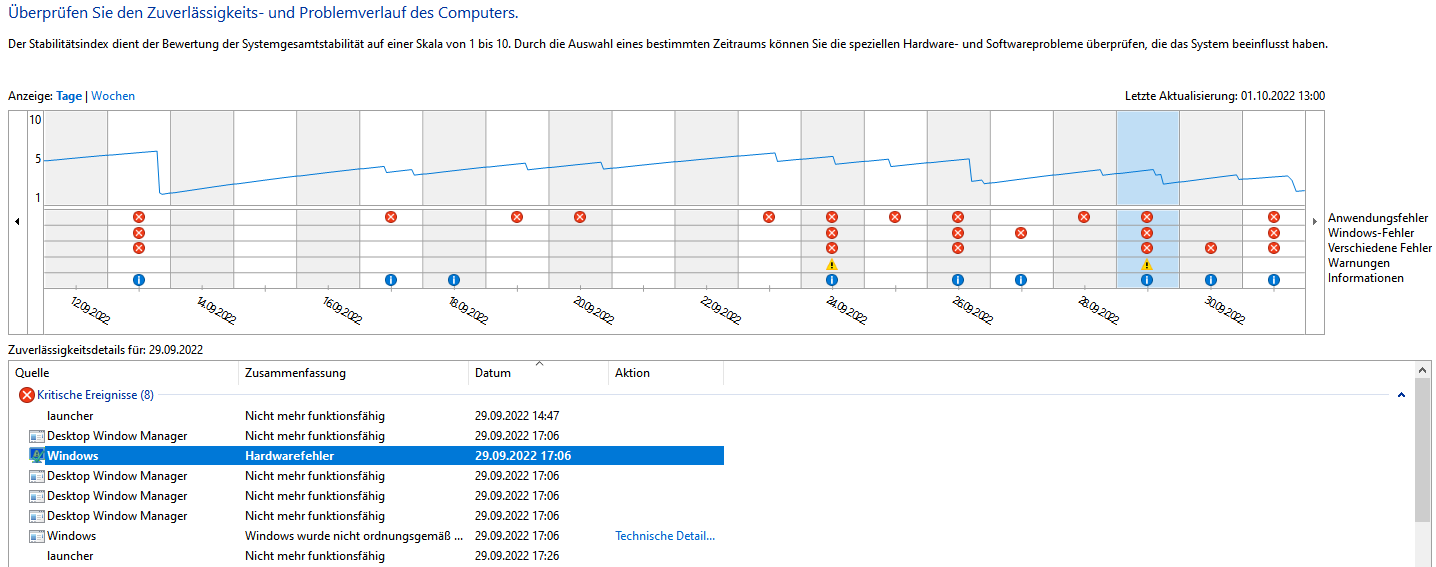 Mein PC stürzt beim zocken dauernd ab. Die Lüfter arbeiten wie verrückt, selbst auf niedriger Grafikeinstellung. Kurz danach, diese Meldung im Zuverlässigkeitsverlauf: Der Computer wurde nach einem schwerwiegenden Fehler neu gestartet. Der Fehlercode war: 0x00000133 (0x0000000000000001, 0x0000000000001e00, 0xfffff8064befb320, 0x0000000000000000). Ein volles Abbild wurde gespeichert in: C:\WINDOWS\MEMORY.DMP. Berichts-ID: 9f49dec2-cb2f-431c-ba63-310a97f0a97a.