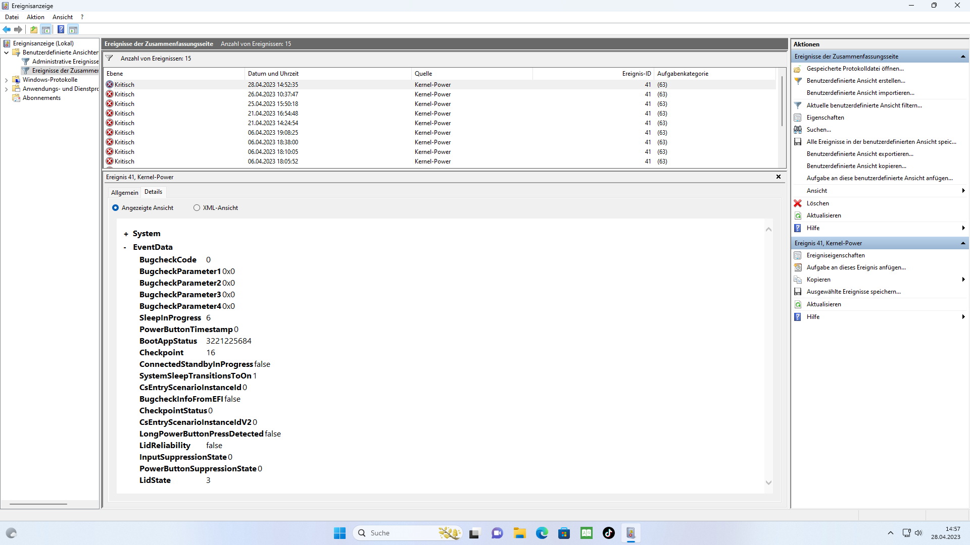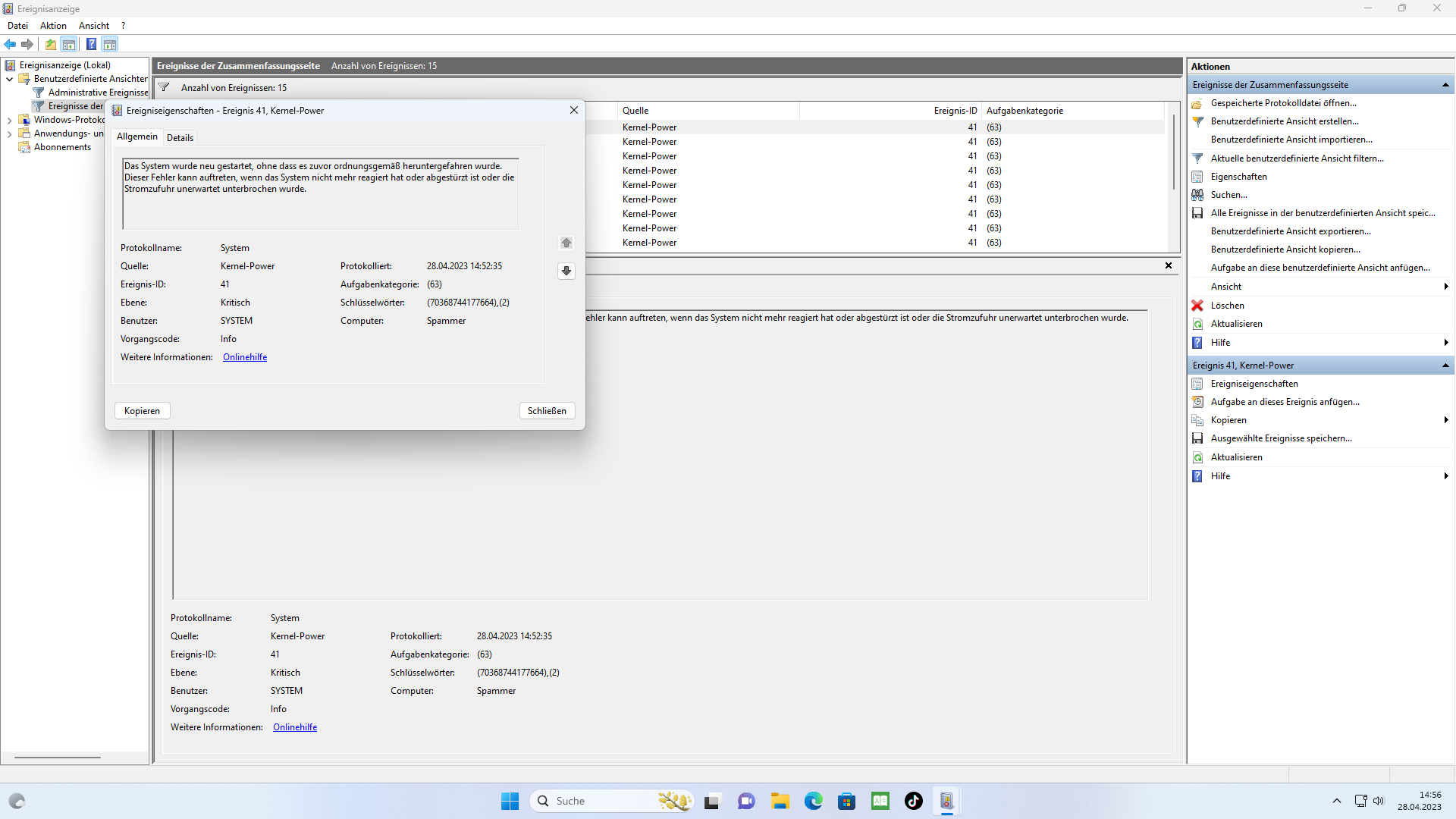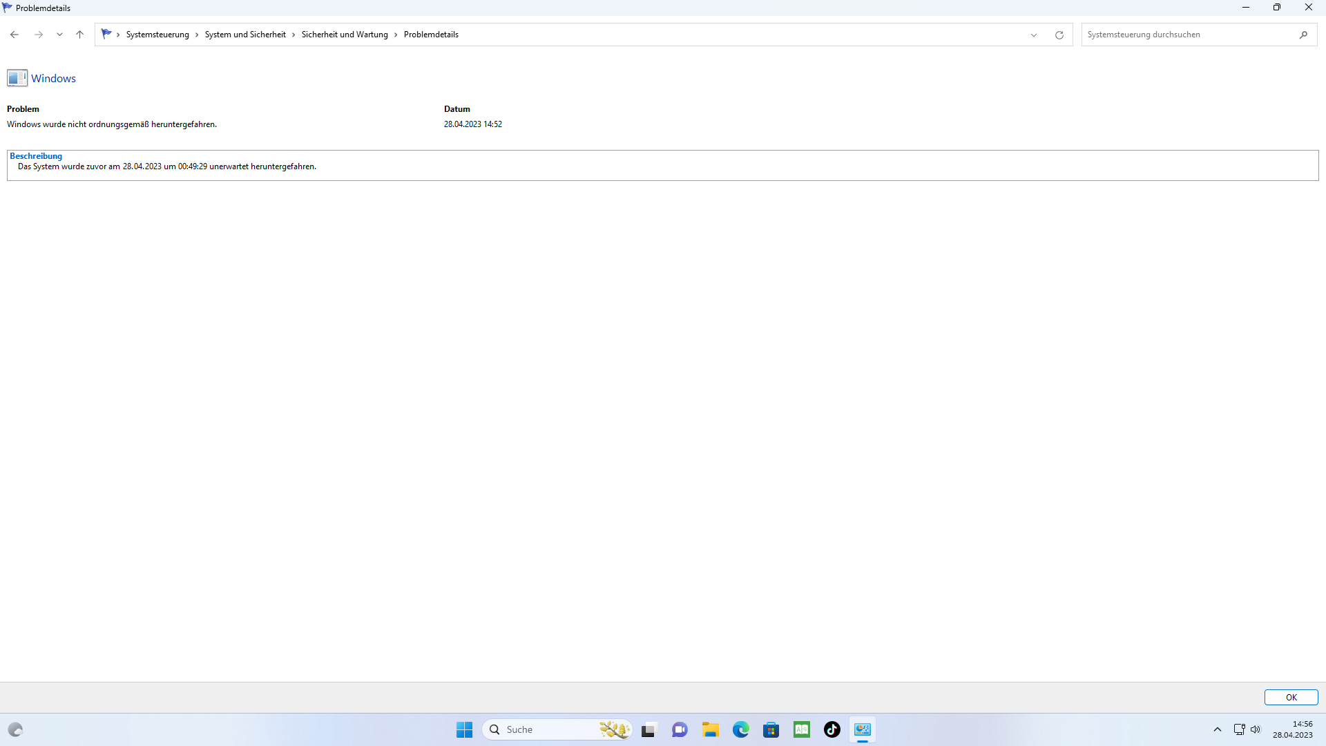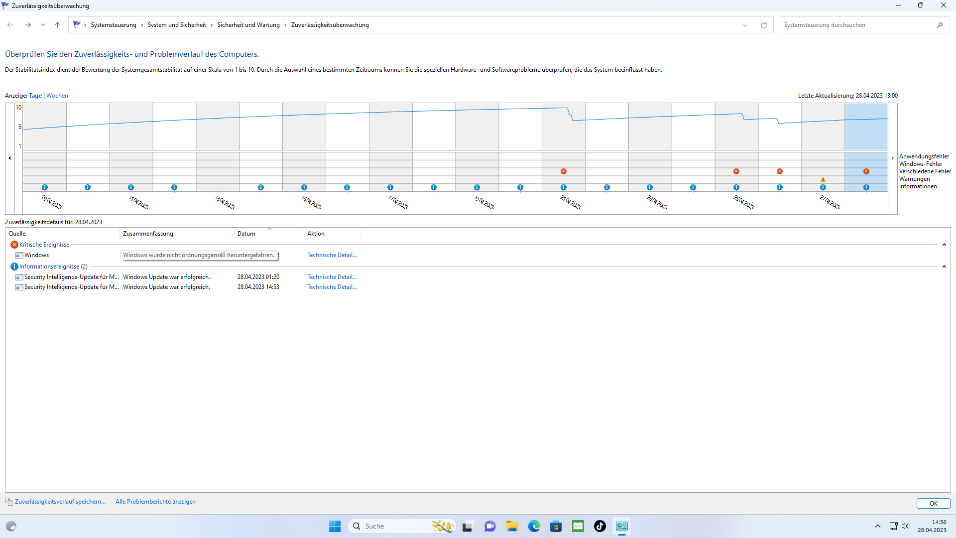 2. Beschreibe dein Problem. Je genauer und besser du dein Problem beschreibst, desto besser kann dir geholfen werden (zusätzliche Bilder könnten z. B. hilfreich sein):Hallo Leute , wenn ich meinen PC einschalte steht im Zuverlässigkeitsverlauf manchmal das das Gerät beim letzten herunterfahren abgestürzt ist. Man merkt davon nichts der Rechner fährt herunter wie immer. Dieses Problem tritt auch nicht immer auf sondern manchmal ein paar Tage nicht und dann wieder. Der Rechner macht sonst überhaupt keine Probleme und läuft einwandfrei. Trotzdem muss es ja irgendein Problem geben. Ich habe aber keinen Plan welches das sein könnte. Deswegen meine Post hier im Forum