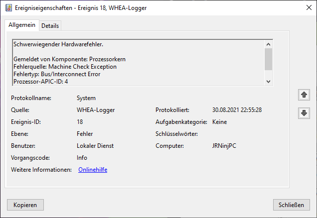 Ich habe das Problem das beim zocken einfach mein PC abstuerzt, dass geschieht bei den SPielen Apex Legends und Call of Duty Warzone direkt waehrend des Starts IMMER. Und jetzt ist es auch schon einfach so waehrend des Arks zockens passiert 2 mal hintereinander. Beim Absturz gibt es kein BlueScreen der PC startet automatisch neu und braucht dabei viel laenger als bei einem normalen Start er laedt ewig diesen Windows kreisel oder man kann im Startscreen (der Bildschirm bevor man sich einloggt) die Maus/Tastatur ewig nicht benutzten. Jedes mal wenn er abstuerzt ist die selbe Fehlermeldung in der Ereignisanzeige entstanden, ich habe aber keine Ahnung, was das bedeutet (Screenshot angehangen).