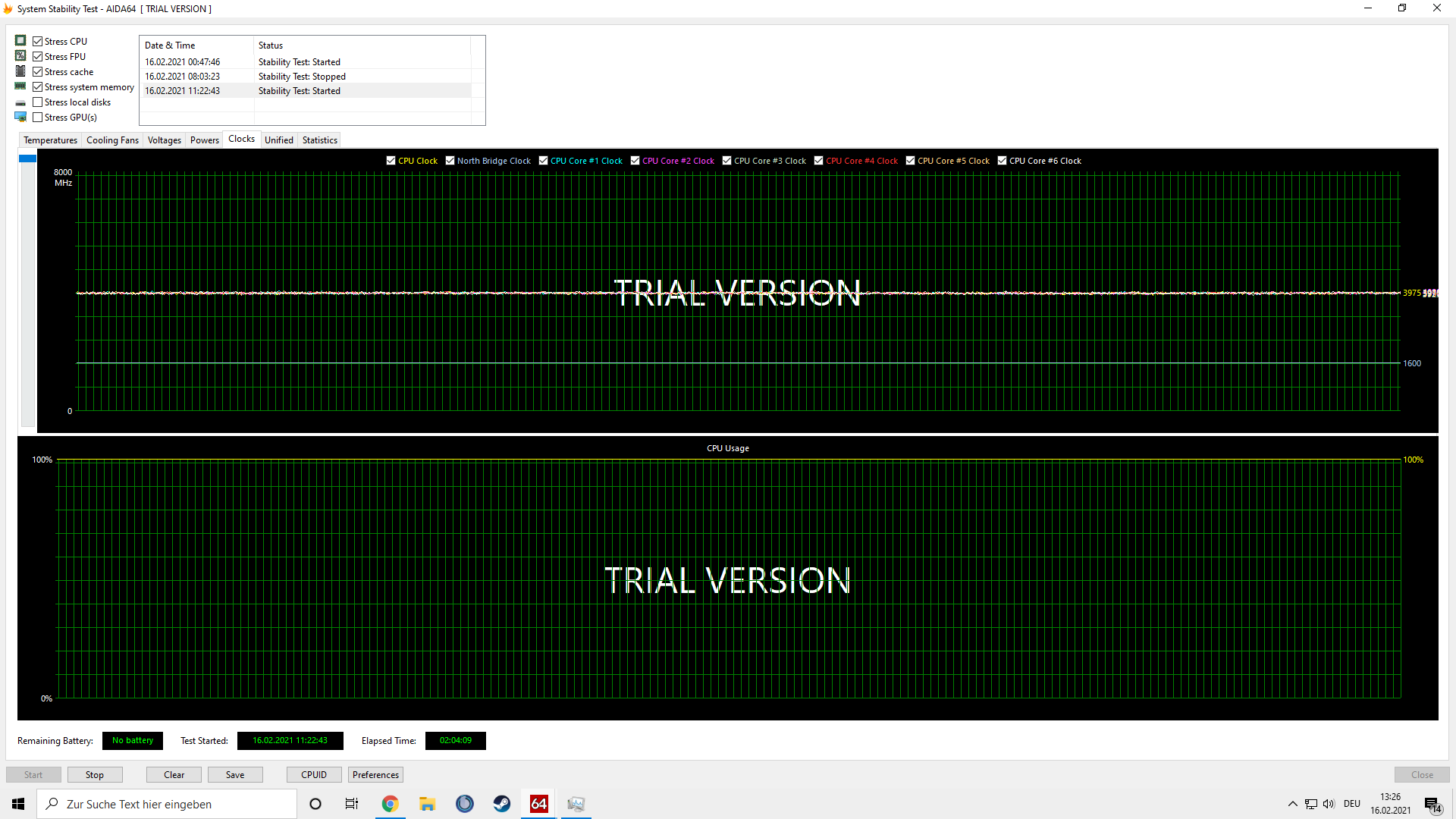 Ich habe jetzt den ADIA64 Extreme Stresstest 2 Stunden laufen lassen. Kein Absturz meines Rechners. Habe Screenshots von den von den Ergebnissen gemacht. Gibt es dort etwas auszusetzen?