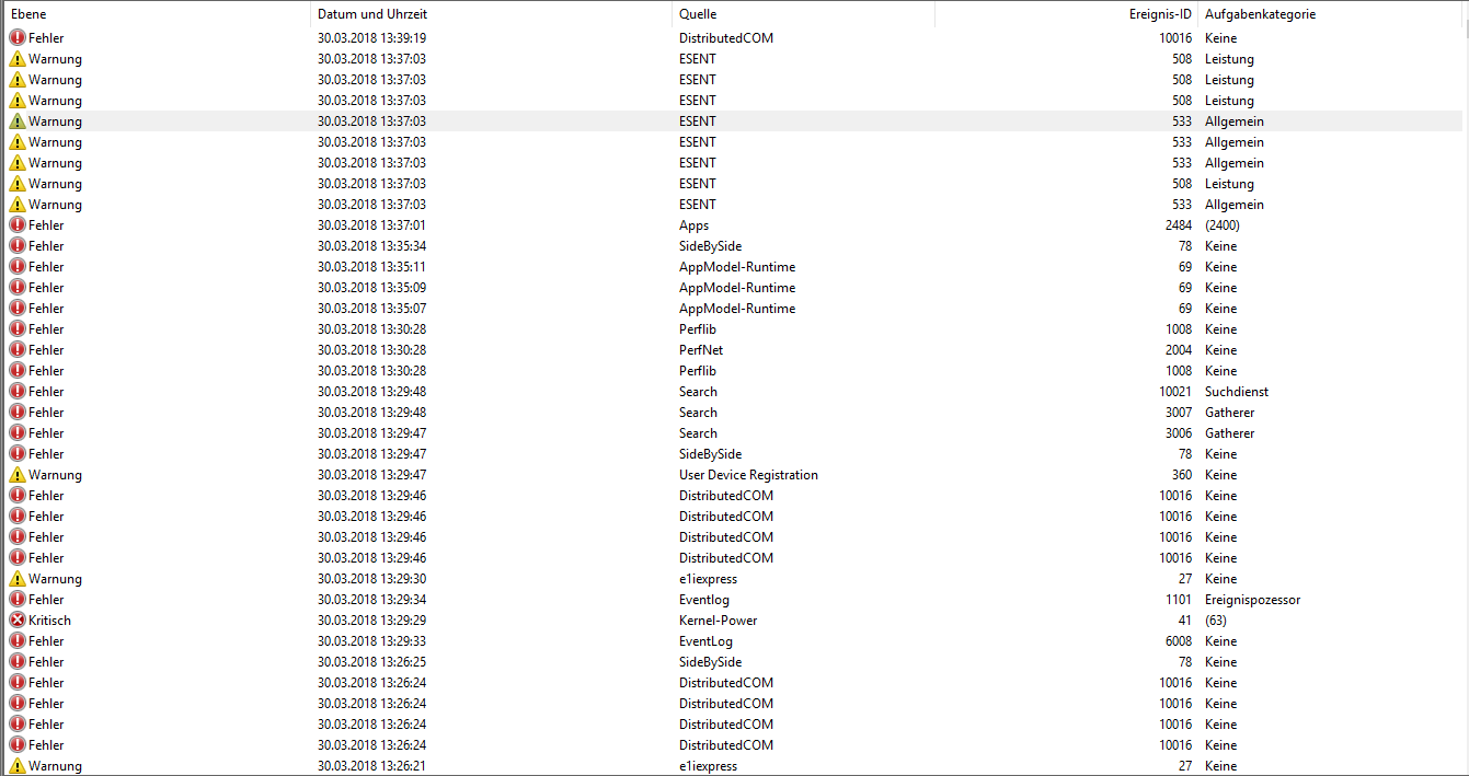 Wie man sieht sind das nicht die einzigen Probleme. Die ganze Ereignisanzeige ist damit voll!