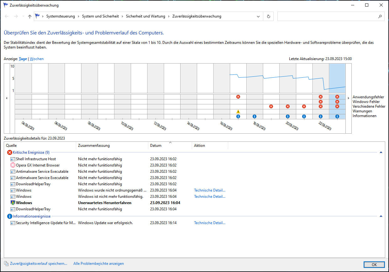 Ich hänge noch ein paar Screenshots von CPU-Z und der Zuverlässigkeitsanzeige an.