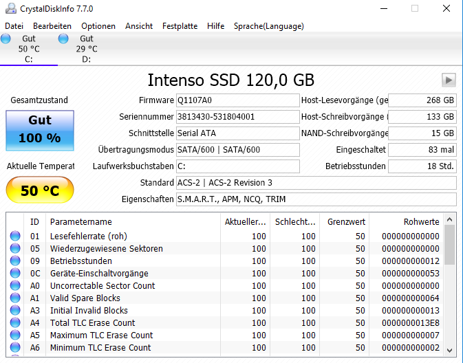 Der SSD ist es ein bisschen zu warm mit 50°C je nachdem( gelb= "Vorwarung"),