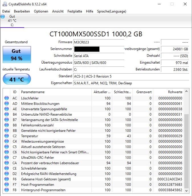 - Festplatte überprüft mit Windows Diagnose und *CrytalDiskInfo -> keine Probleme gefunden