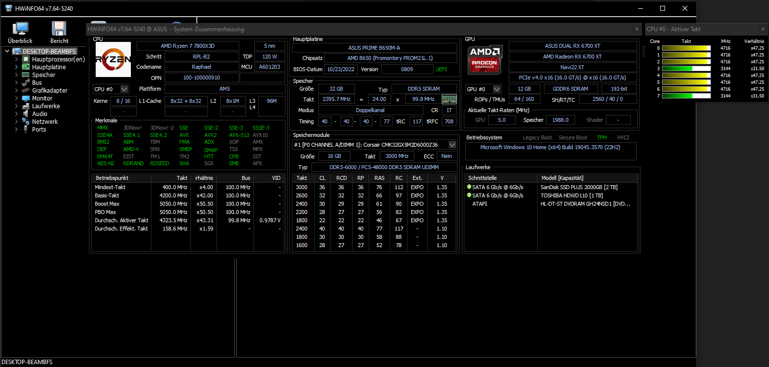 - Arbeitsspeicher (RAM): Corsair Vengeance CL36 AMD EXPO 6000MHz (2x16GB) CMK32GX5M2D6000Z36