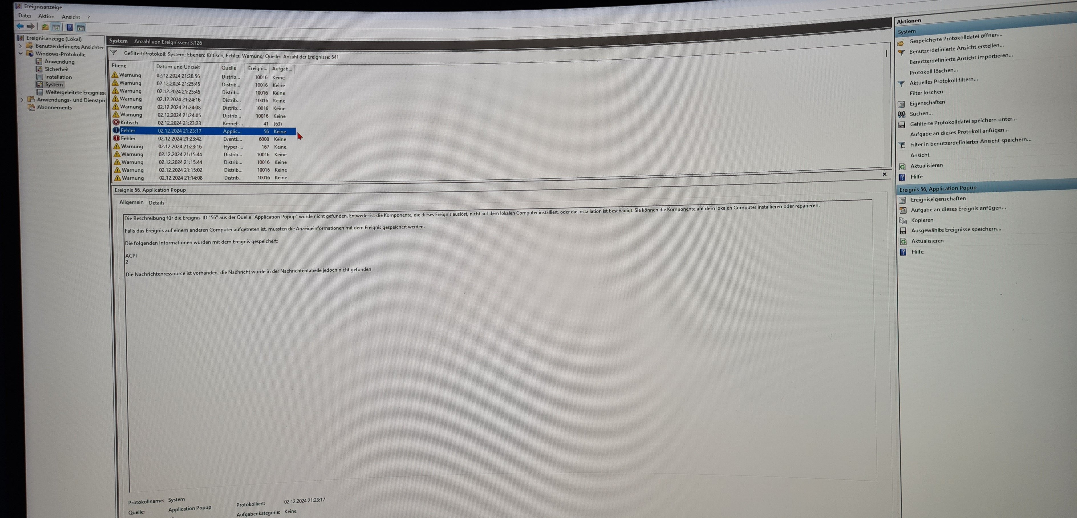 Schon bei ersten Auftreten im Juli habe ich einen Zusammenhang mit diesen Abstürzen finden können, nämlich das 'Application Popup' 'ID-56'. Ich bin wirklich weit davon weg Experte oder sowas zu sein, aber vor jedem einzelnen dieser Abstürze steht genau dieser Fehler in den Windows-Protokollen. (Bilder der Protokolle sind angehängt)