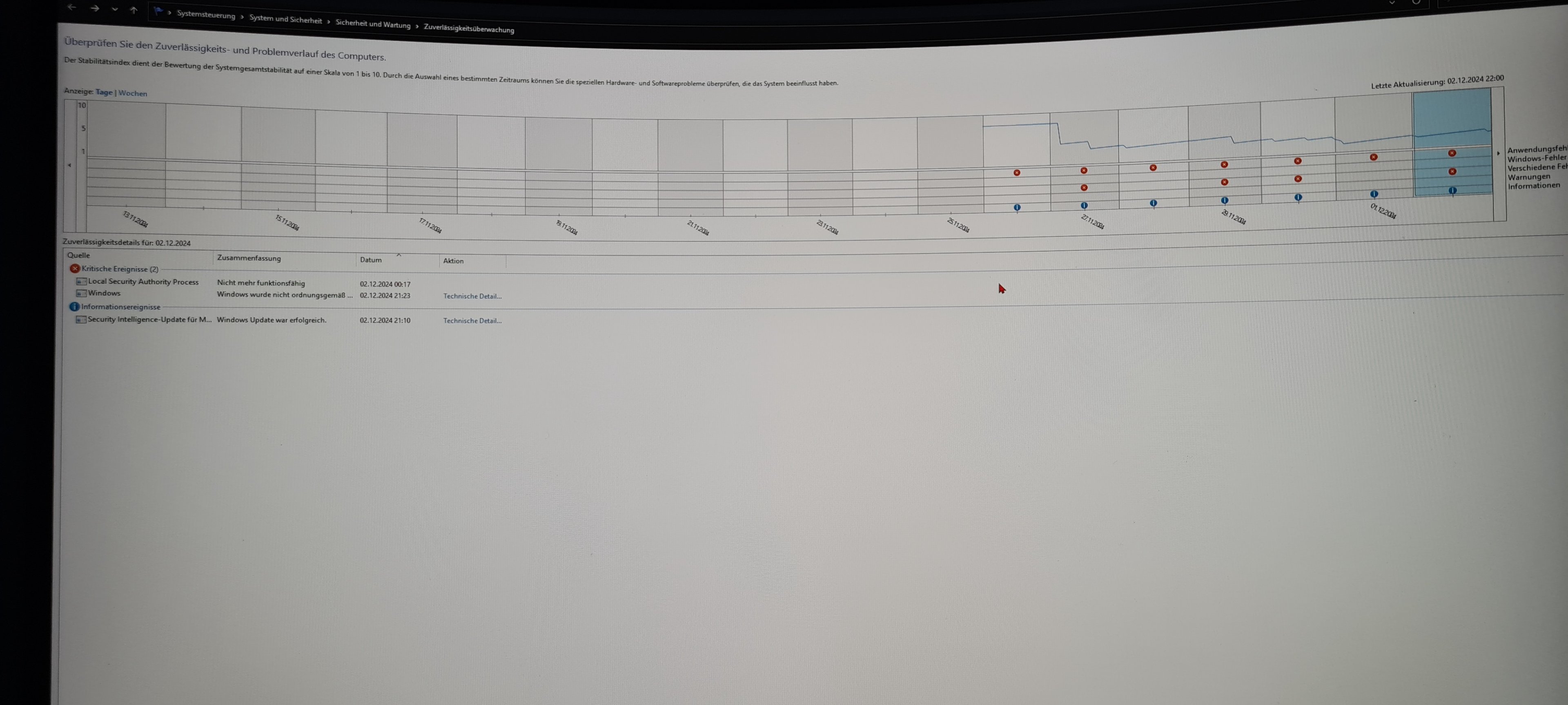 Ich versuche mich so kurz wie möglich zu halten. Ich habe jetzt seit längerer Zeit das Problem, dass mein PC ohne ersichtlichen Grund einfach abstürzt. Konkret bedeutet dies, dass es zum ersten Mal irgendwann Mitte Juli passiert ist. Dann war erstmal für knapp drei Monate komplett Ruhe, doch seit Ende Oktober habe ich diese Abstürze wieder in unregelmäßigen Abständen.