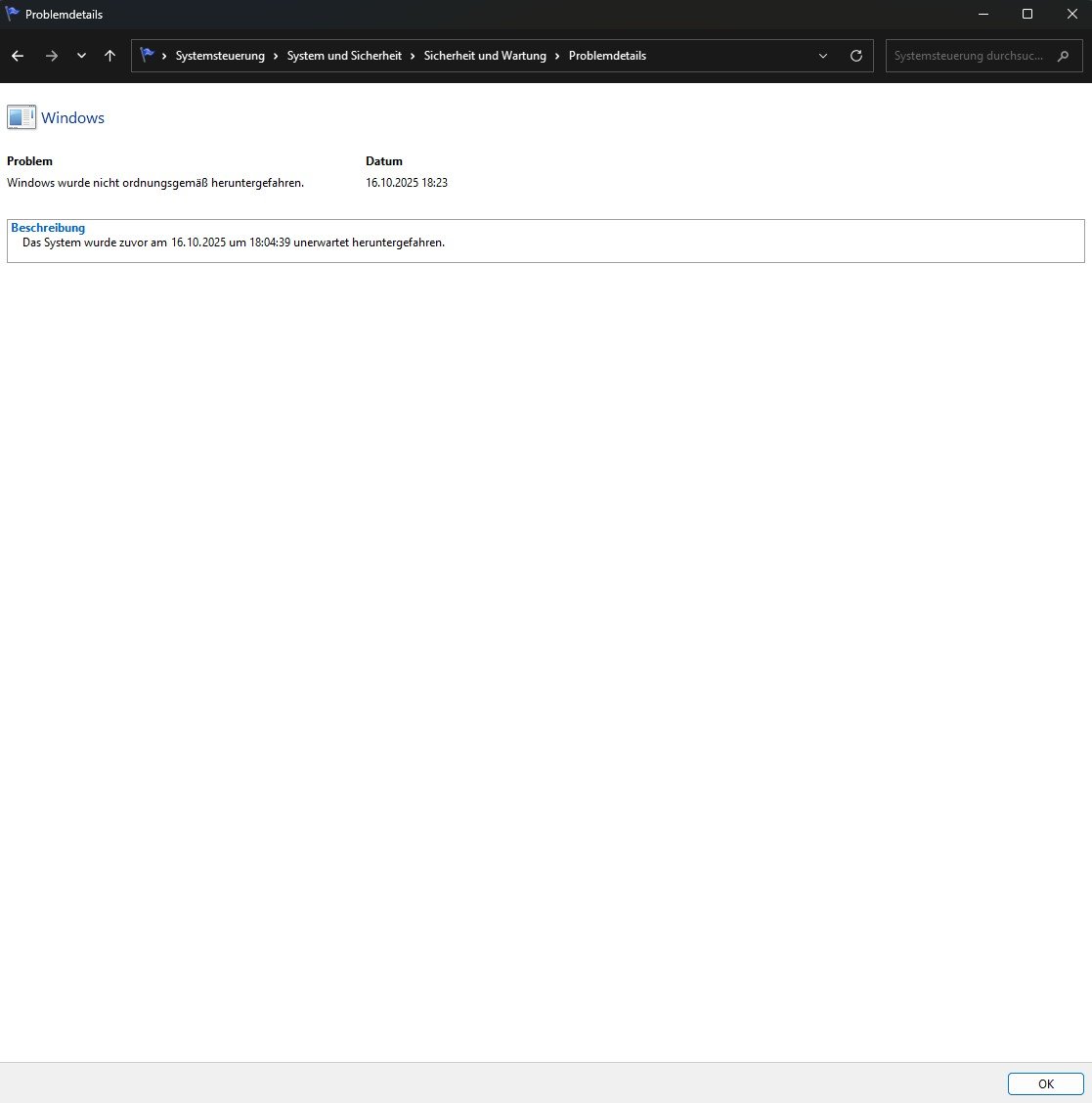 Seit einigen Tagen stürzt mein PC unregelmäßig und nicht reproduzierbar in einen Blackscreen. Mal auf dem Homescreen, mal während ich Zocke, unabhängig vom Spiel. Kurios ist für mich, dass ich den PC dann nicht mehr per Power Knopf, durch langes gedrückt halten, ausschalten kann, sondern ich zwingend die Stromzufuhr unterbrechen muss, um den PC aus diesem Zustand heraus zu bekommen.