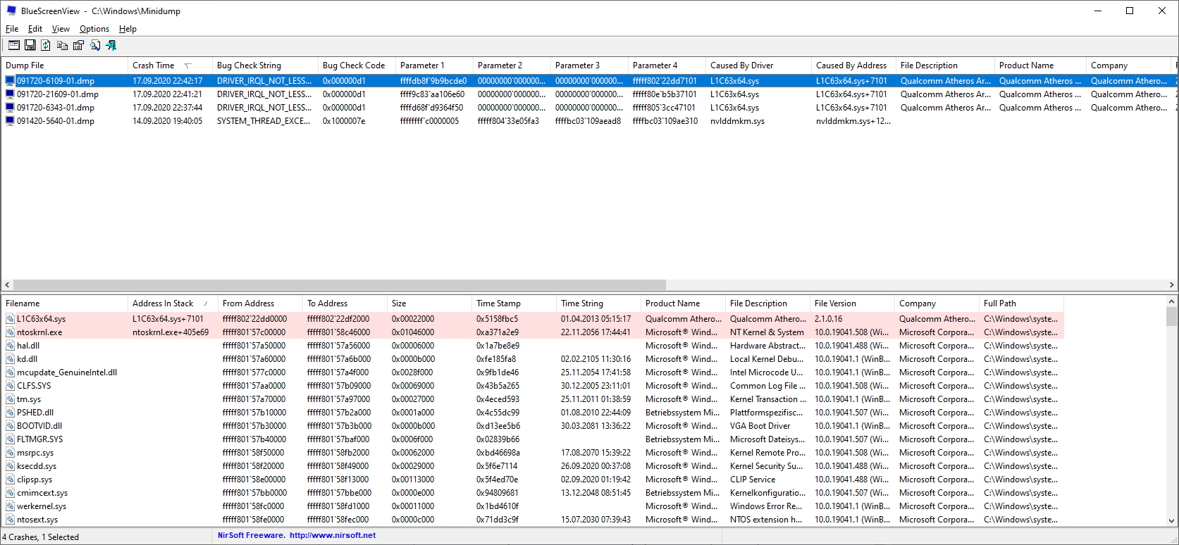 BlueScreenView liefert mir 4 Minidumps zwischen dem 14. und 17.09.2020, wovon drei auf den Netzwerktreiber von Qualcomm Atheros hinweisen (siehe Screenshot).