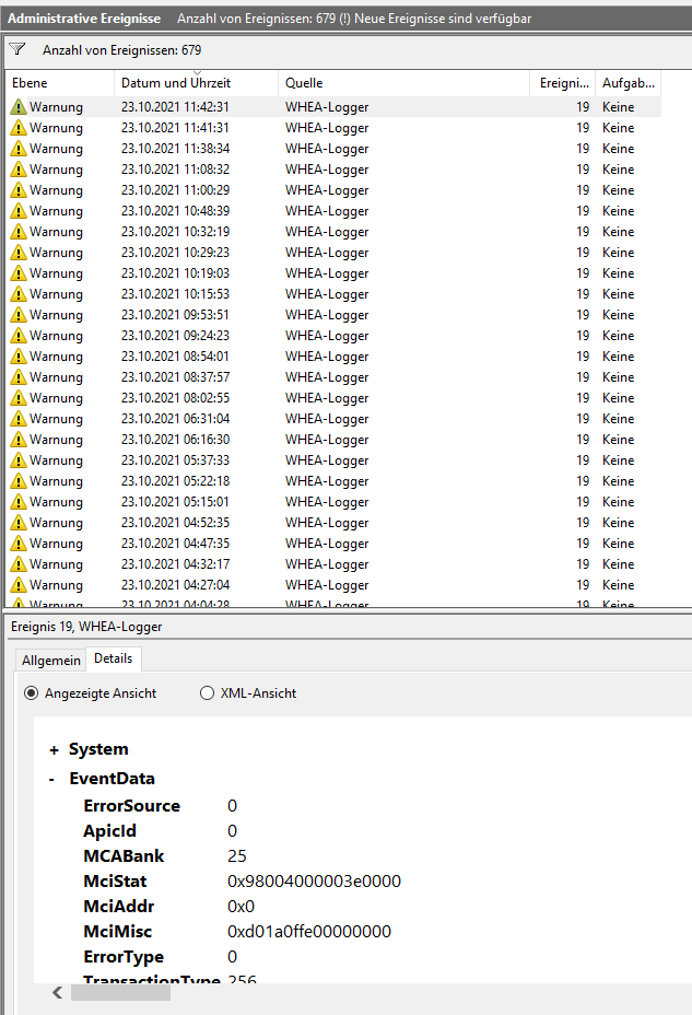 WHEA-Logger Ereignis 18 habe ich nicht, allerdings WHEA-Logger Ereignis 19 (immer die gleichen Details)? Das taucht sehr häufig auf.