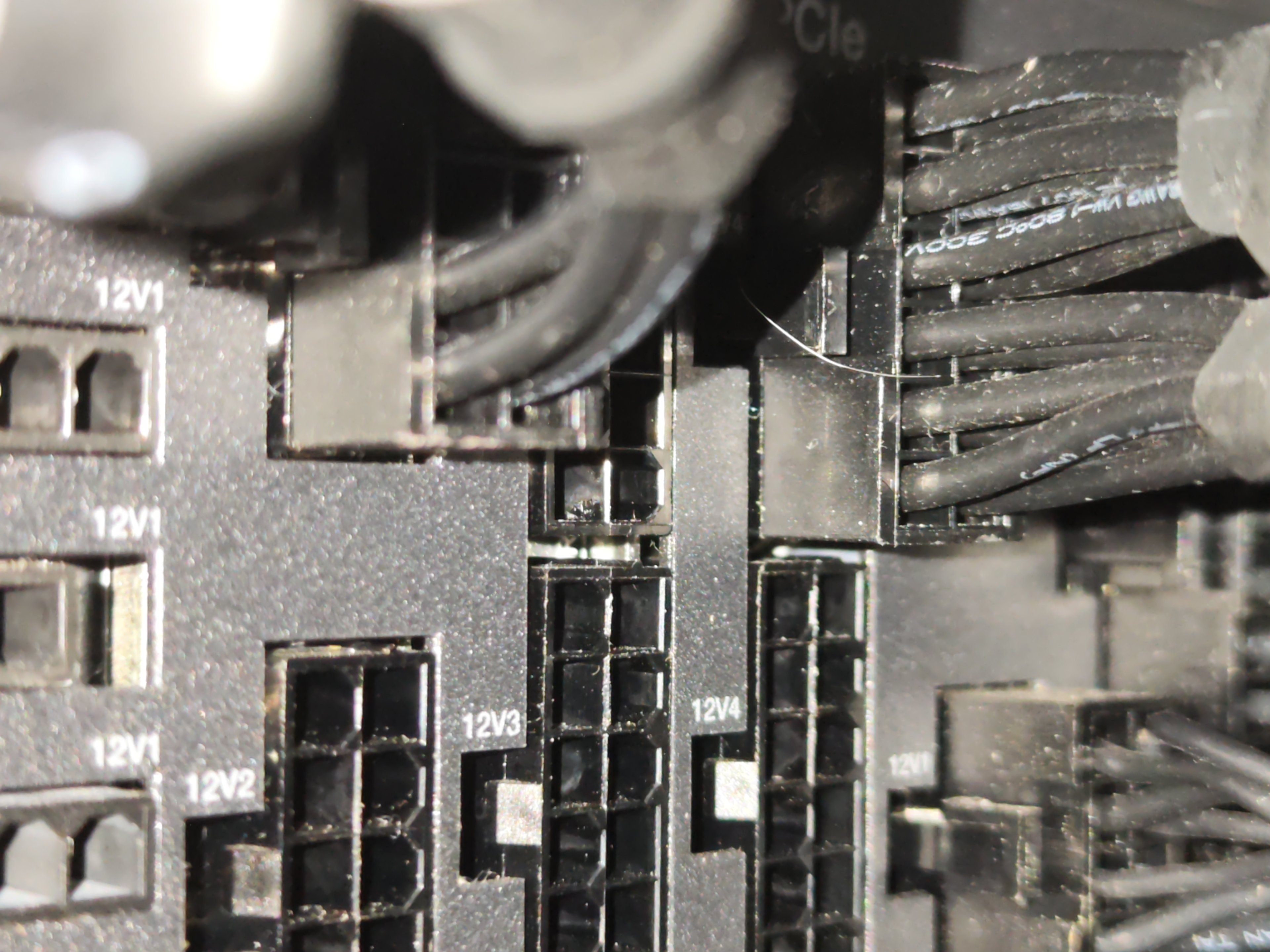 Die einzigen passenden kabel im lieferumfang waren eben diese 12 pin auf 2x6+2-pin-connectorkabel, habe jeweils einen 12 pin in 12v3 und 12v4 unten gesteckt und einen 6+2 von jedem kabel in die VGA, dabei die kabelstränge verfolgt, irrtum ausgeschlossen.