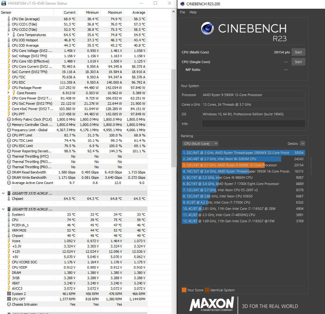 Cinebench scheint wie andere Renderer nicht zu boosten, PackagePower bleibt konstant bei <92W, Temps <59°C