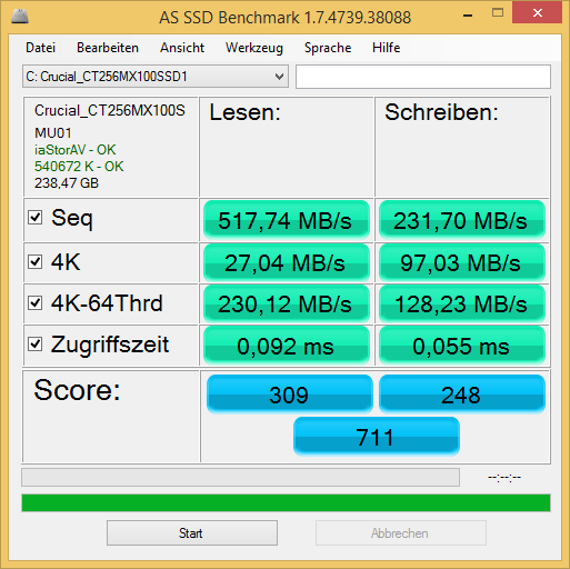 1 x Crucial MX100 256GB, SATA 6Gb/s (CT256MX100SSD1)