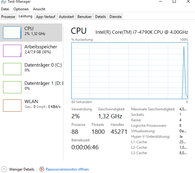 Mein vermutung liegt beim Prozessor dem i7 4790K. Wenn ich den Taskmanager öfnne und auf Leistung klicke beginnt die Anzeige (der LEistung der CPU) immer mit 100%. Irgendetwas passt da nicht.