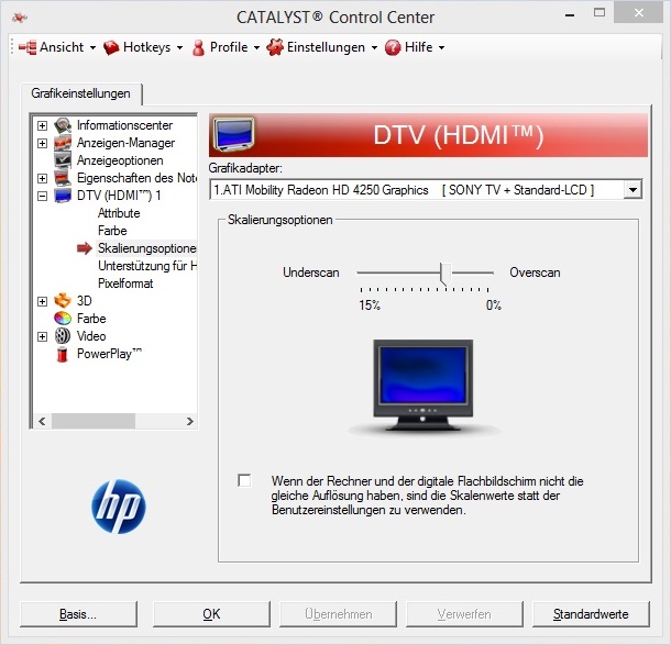 Da ich keinen HDMI Anschluss am PC habe habe ich über einen Adapter (DVI --> HDMI) (http://www.conrad.de/medias/global/ce/9000_9999/9700/9710/9714/971410_LB_02_FB.EPS_1000.jpg) meinen Fernseh mit einem HDMI Kabel verbunden. Wenn ich dann beim TV (32" Philipps) die Quelle HDMI auswähle...bekomm ich auch das Bild. Allerdings ist komplett drum rum ein schwarzer Rahmen...ich kann das Bild am TV also nicht voll ausnutzen...es ist mir nicht möglich auf "Vollbild" zu stellen... ich weiß nur dass das früher schonmal geklappt hat...