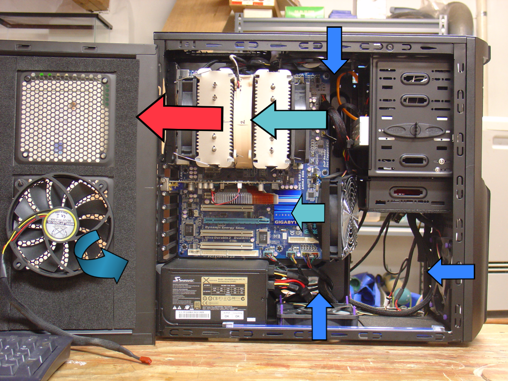 Würde man den CPU Kühler drehen, so dass der Lüfter des Kühlers Richtung GPU bläst, wäre zwar die CPU besser gekühlt, aber die GPU würde nun die warme Luft der CPU abbekommen; auch schlecht.