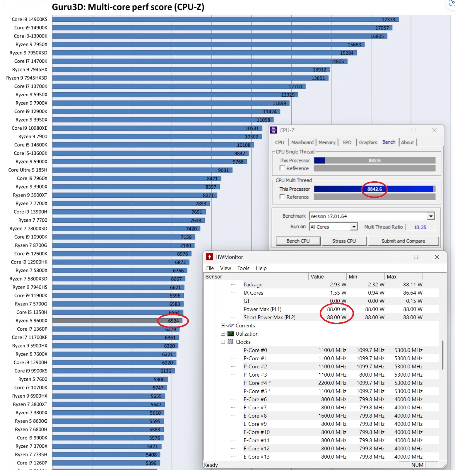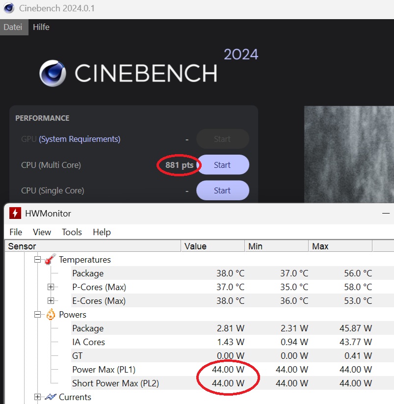 ein 14600K mit einem Powerlimit von 88W (entspricht dem Limit eines 9600X)