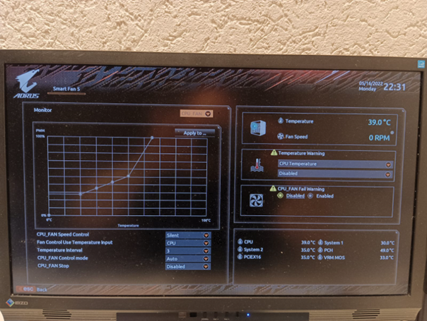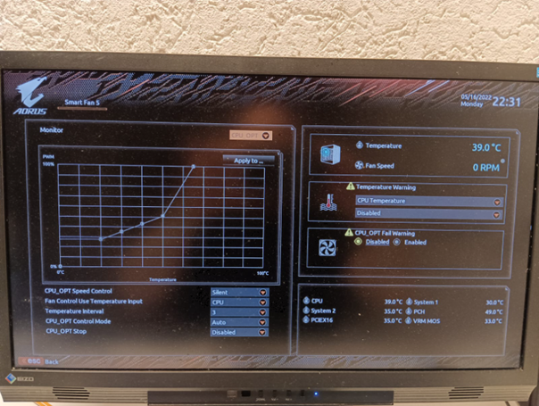 Deine Kurve für den CPU Kühler ist für meinen Geschmack nicht gut. Du bist mit 39 Grad schon