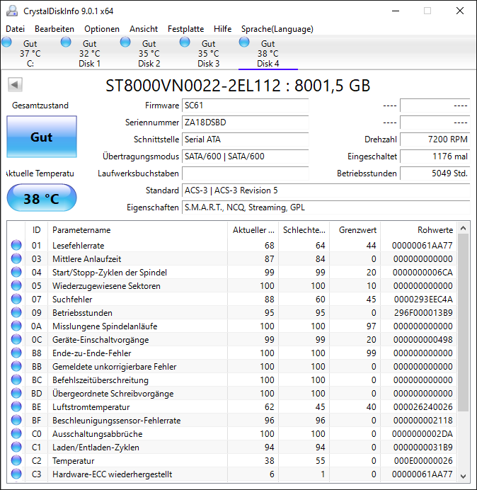 Zusätzlich zeigt CrystalDiskInfo die Festplatte nicht in seiner Liste an.