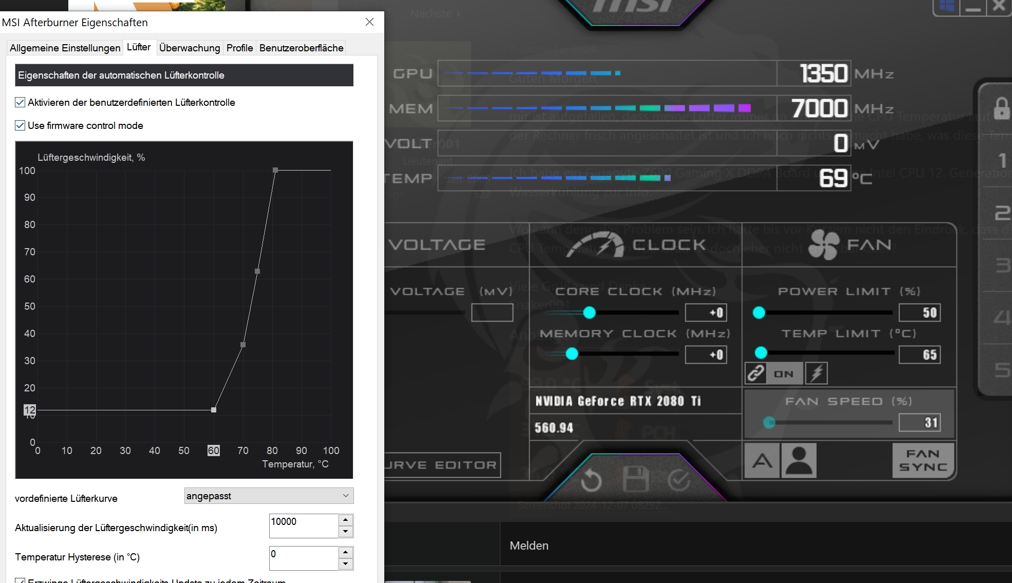 2080Ti MSI Duke (auf 50% Power Target), angeschlossen an UHD144hz und FHD120hz (Dieses Power Management Tool funktioniert bei mir nicht, also bleibt der Takt immer gleich)