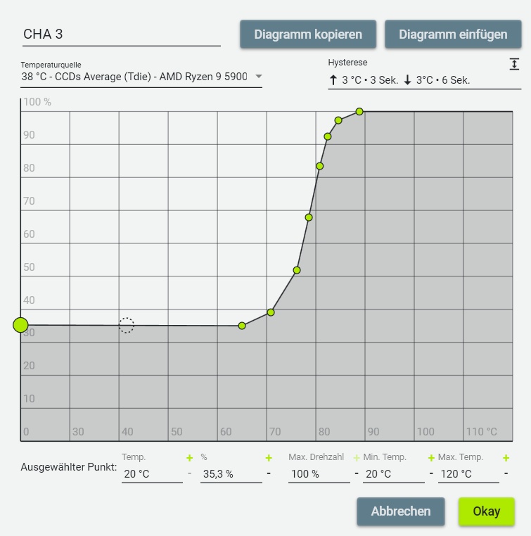 - Eine feste Drehzahl für sämtliche Lüfter (GPU ausgeschlossen) ~600 ¹/min bis ~800 ¹/min, keine Kurven.