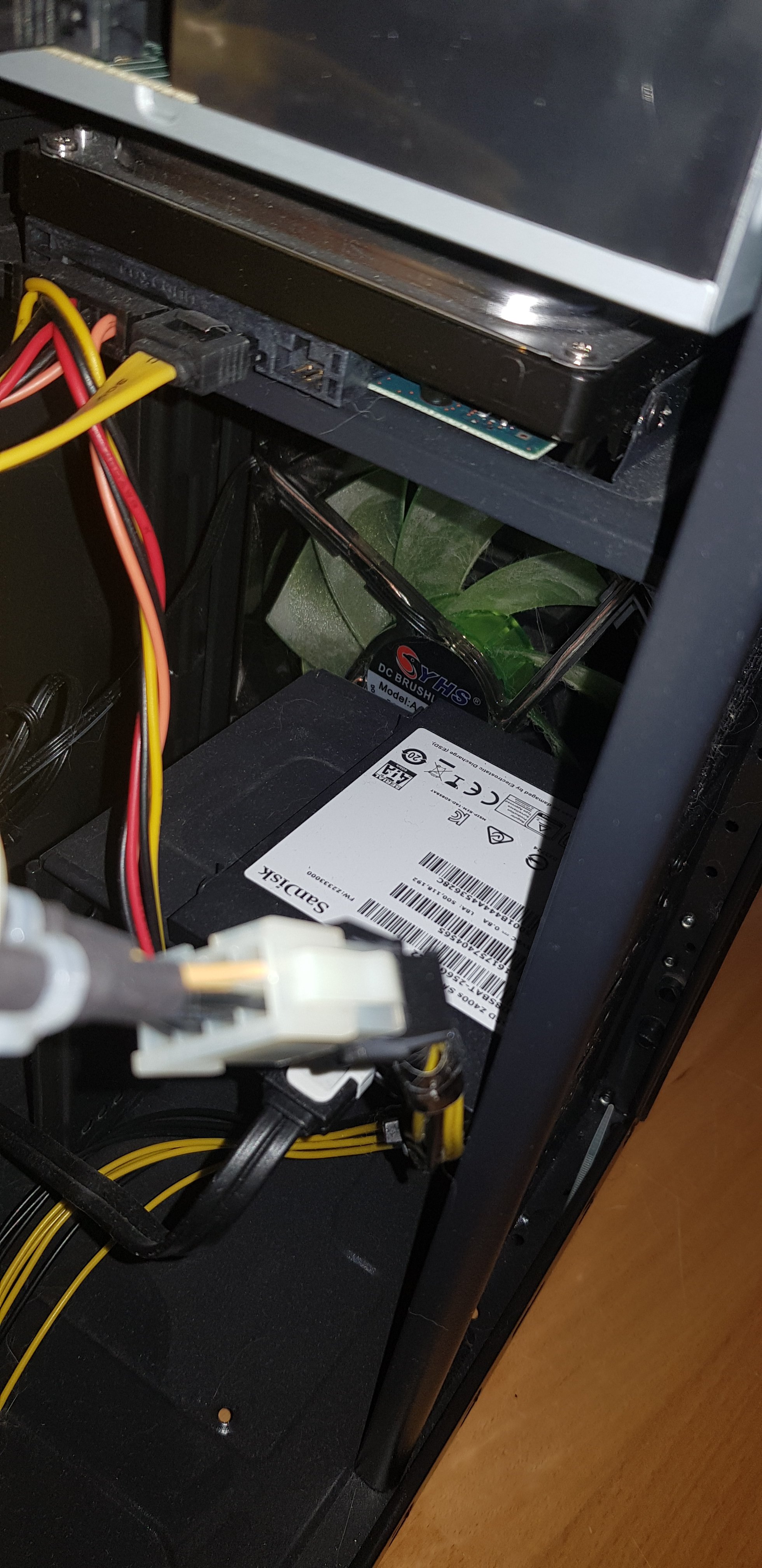 Dann solltest du mindestens einen Lüfter installieren, der die warme Luft nach draußen bläst. Entweder hinten oder nach oben. Was dein Gehäuse halt zulässt. Auch der vordere Lüfter ist wichtig. Die Festplatte behindert den Airflow noch zusätzlich und ich denke es gibt bessere Lüfter, wie den in deinem Gehäuse verbauten.