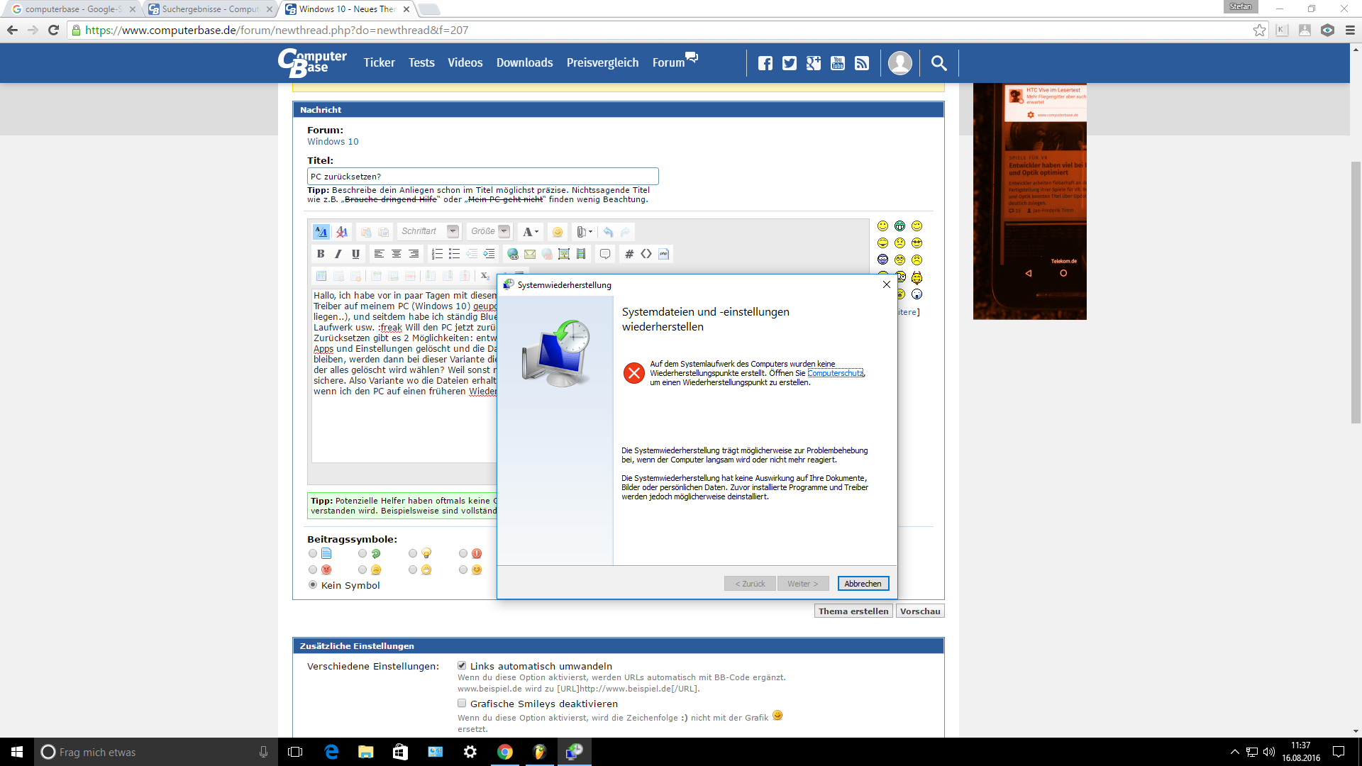 Hallo, ich habe vor in paar Tagen mit diesem Programm ( http://www.chip.de/downloads/DriverEasy_45397534.html ) ein paar Treiber auf meinem PC (Windows 10) geupdated (mein Internet war langsam und ich dachte es könnte vlt. an veralteten Treibern liegen..), und seitdem habe ich ständig Blue Screens, mein Kasypersky spinnt und er sagt mir dauernd was von beschädigtem Laufwerk usw. :freak: Will den PC jetzt zurücksetzen, aber die ganzen Bilder und Videos auf der Festplatte nicht verlieren. Beim Zurücksetzen gibt es 2 Möglichkeiten: entweder es werden alle Apps, Einstellungen und Dateien gelöscht, oder es werden nur die Apps und Einstellungen gelöscht und die Dateien bleiben erhalten. Wenn ich jetzt die Variante wähle, bei der die Dateien erhalten bleiben, werden dann bei dieser Variante die fehlerhaften Updates der Treiber gelöscht oder muss ich die "radikale" Variante, bei der alles gelöscht wird wählen? Weil sonst müsste ich mir ein anderes Speichermedium kaufen wo ich die Bilder und Videos dann sichere. Also Variante wo die Dateien erhalten bleiben ausreichend oder muss es die sein bei der alles gelöscht wird? Achja und wenn ich den PC auf einen früheren Wiederherstellungspunkt zurücksetzen will geht das nicht (Anhang). Danke