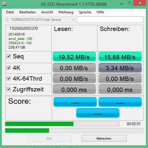 Da der PC beim hochfahren auch nicht besonders schnell war, habe ich die SSD mittels AS SSD Benchmark gemessen, da ich keine Verbesserung gegenüber einer normalen HDD Feststellen konnte.
