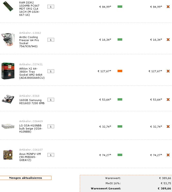 512MB DDRRAM Infineon Aeneon PC 400 (1Riegel) 48,73€ 160GB Hitachi HDT722516-DLAT80 ATA133 50,07€ Asus 256MB EAX1300PRO/TD PCIe 63,32€ DVD Brenner Samsung SH-W163A SATA 42,47 €