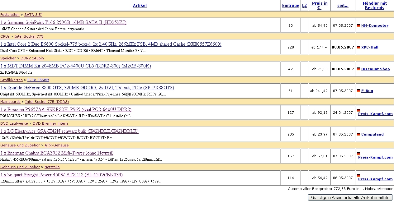 Als Mainboard habe ich das Foxconn ausgewählt, da er nicht übertakten möchte. Und dieses Mainboard ohne Übertakten hier Testsieger ist: http://hardware.thgweb.de/2007/04/10/intel_p965_chipset_motherboards/page43.html