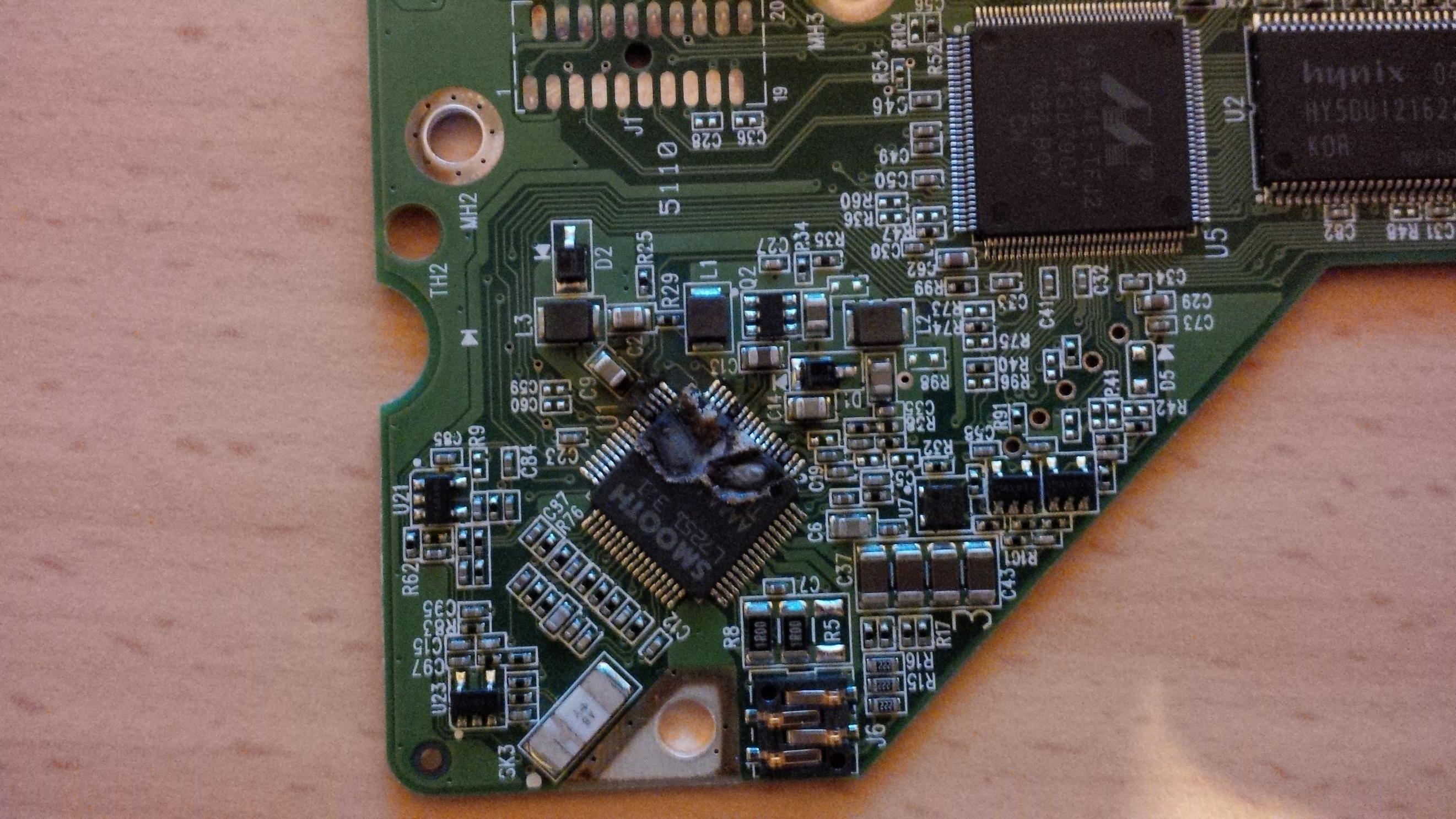 Sicher nicht - wenn dann müsste schon der Flash-Chip von der alten Platine auf die neue umgelötet werden. Allerdings sollte ein Motorcontroller nicht so aussehen, der Fehler kann hier durchaus auch im inneren der HDD liegen (Kurzschluss des Motors, etc.).fz21z schrieb:was sagen die Profi's, kann man bei der WD5003ABYX einfach das PCB wechseln und die Platte läuft wieder?