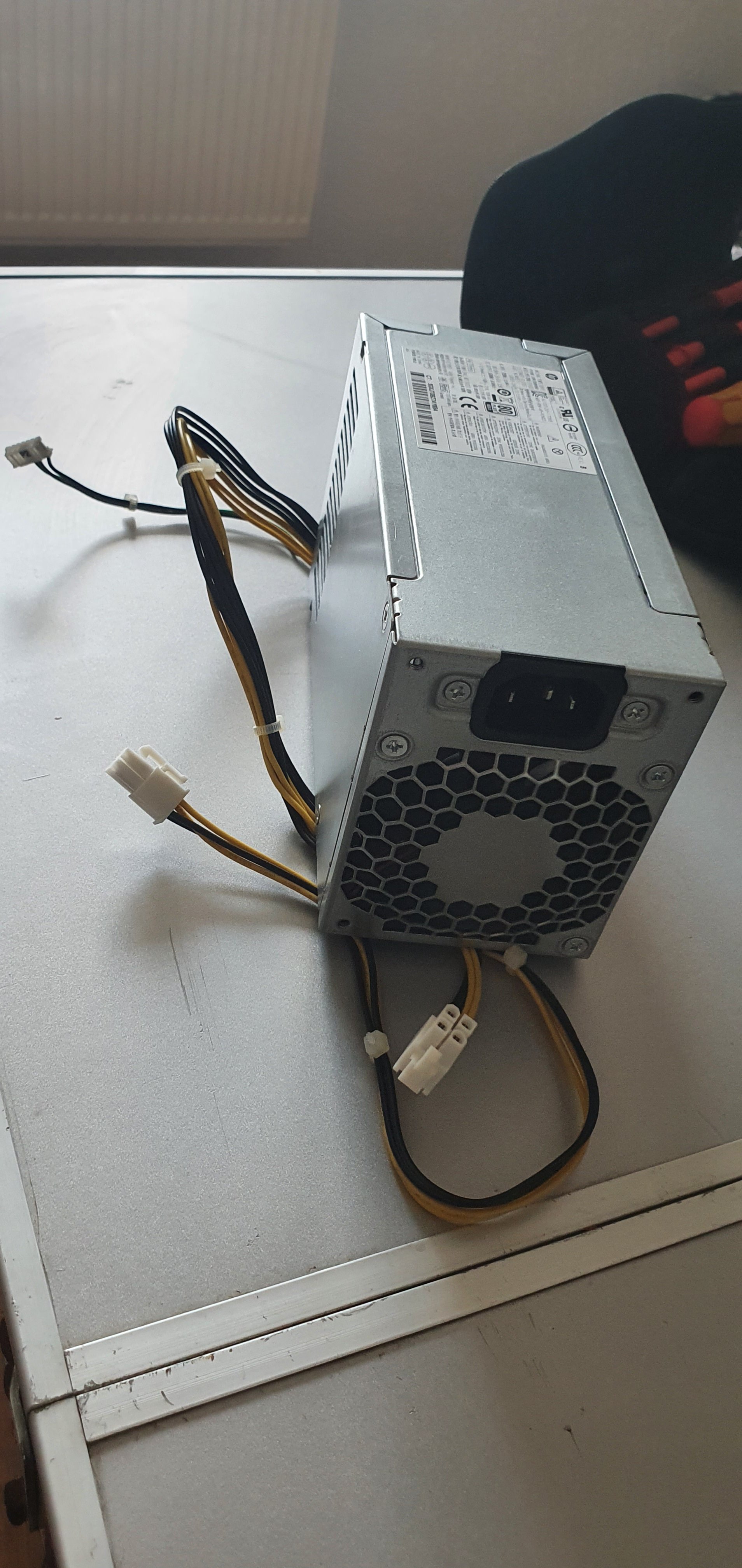 Auf dem Netzteil selbst ist zumindest keine Standbyleitung verzeichnet, es ist auch ein reines 12V-Gerät. Sucht man im Netz nach einer Dokumentation der Hauptplatine, dann findet man eigentlich fast nichts, außer Schaubildern. Die beiden 4-Pin versorgen jeweils CPU und Hauptplatine, der seltsame breite 6-Pin (?) scheint für die Lüftersteuerung des Netzteils zu sein, wenn man sich andere aktuelle Modelle von HP ansieht.