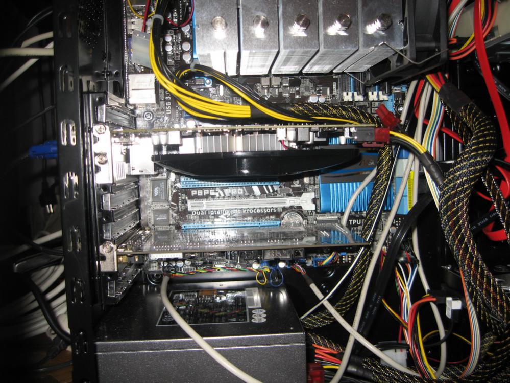 Der Eine ist generell durch das 2-Slot Design meiner Grafikkarte blockiert, und im anderen würde die Karte (zumindest fast) am CPU-Kühler (Mugen II) anstehen sowie die Luft bei der Grafikkarte vermutlich aufheizen; siehe Bild.