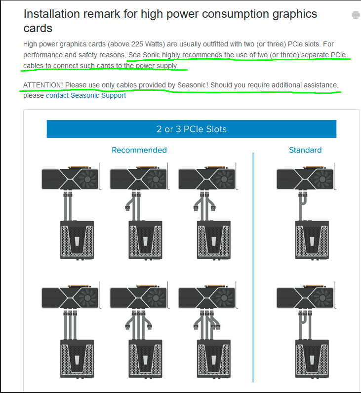 leider war bei meinem Seasonic Prime Platinum nur ein PCI-e Kabel (PSU auf 2x 8pin) dabei. Ich habe eine GPU mit 2x8pin Anschlüsse und würde gerne jeden 8pin mit einem separaten Kabel anschließen, falls das sinnig ist. Ich habe gelesen, dass die PSU/PCI-e Kabel alle herstellerspezifisch sind und habe nun Angst, das falsche zu kaufen und meine GPU zu beschädigen.