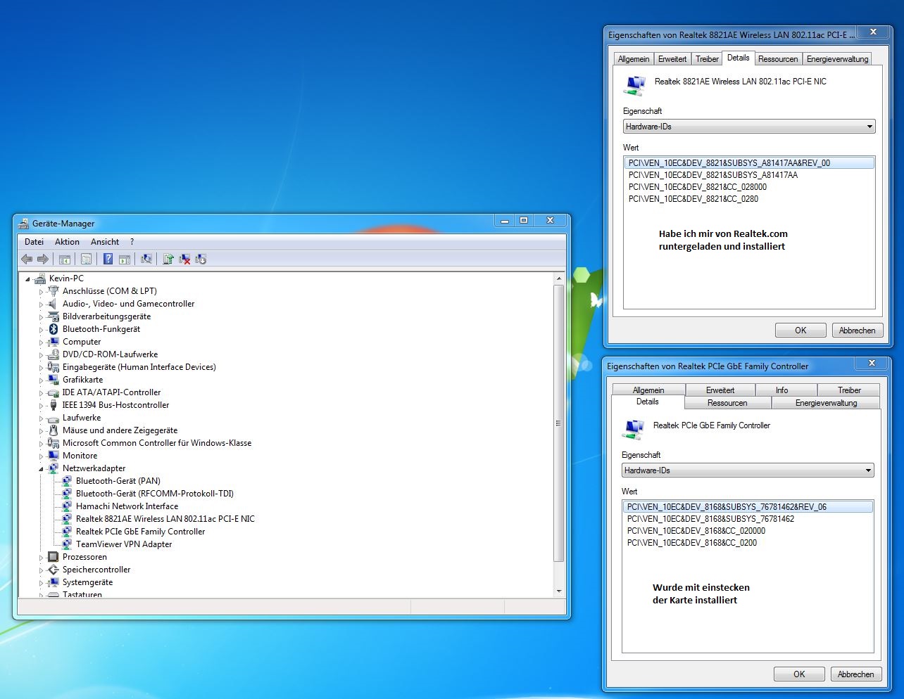 Es wurden zwar Treiber installiert und im Geräte-Manager wurde mir der "Realtek PCIe GbE Family Controller" angezeigt und auch dass er im PCI-Bus 4 steckt, in der tatsächlich die Karte stecht, aber eine Verbindung zu meinem Router wurde mir nicht ermöglicht. Ich habe dann den halben Tag damit verbracht die richtigen Treiber zu finden und habe es dann auch irgendwann irgendwie hinbekommen, dass er mir das 5ghz band meines Routers anzeigt und sich verbinden lässt.