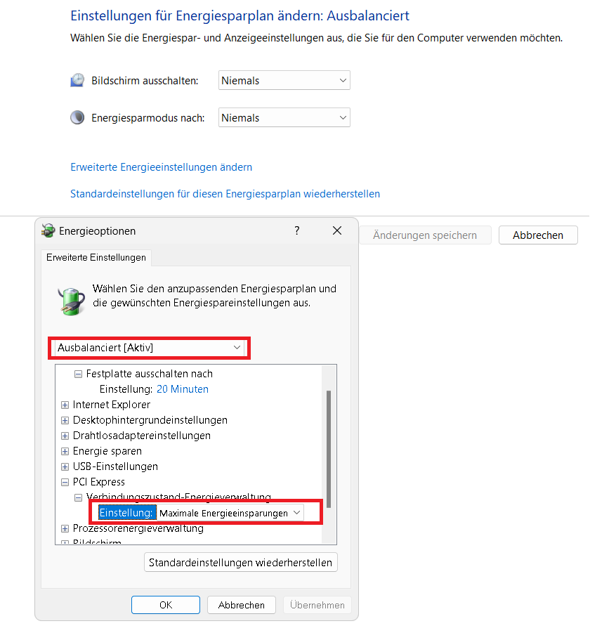 Wenn es im BIOS deaktiviert bleibt, sollten alle PCIe Ports die Stromspartechniken nicht erlauben.